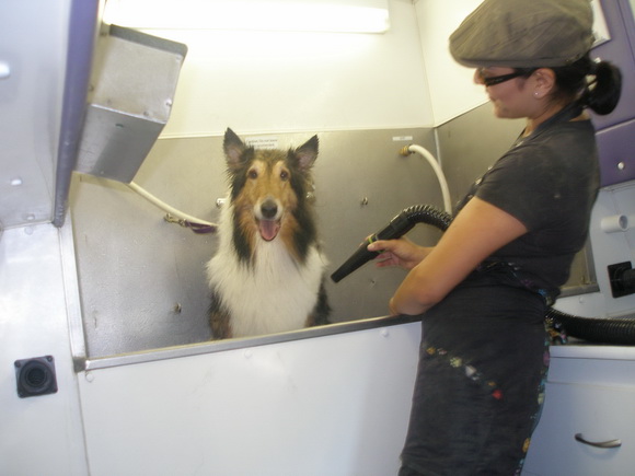 Wednesday the 13th – SASSIE GOES MOBILE! – I went to Voice Trax West in the morning to do four more commercials for HH Gregg electronics stores, a chain in the eastern part of the U.S. When I got back home I met up Caroline from Wag My Tail mobile grooming. Since Sassie has gotten older, her ability to stay in a groomer’s all day has become limited. I think it was too much standing for her, as she would come home and be really stiff. So it was time to start hiring a mobile groomer. It was going to cost more, but it’s worth it. Sassie could be groomed right outside my house while I was inside doing work. In fact, one of the spots for HH Gregg I needed to do involved my character singing along to a famous disco song. They didn’t have the song available at the session, so I dug it out of my collection at home, and recorded the voice tracks at home. That way I could e-mail them over and they could marry them to the track. Though Sassie was a little nervous at first, it ended up being really great. In fact, after I was done with my recording, I went out to check on her again and saw this!
