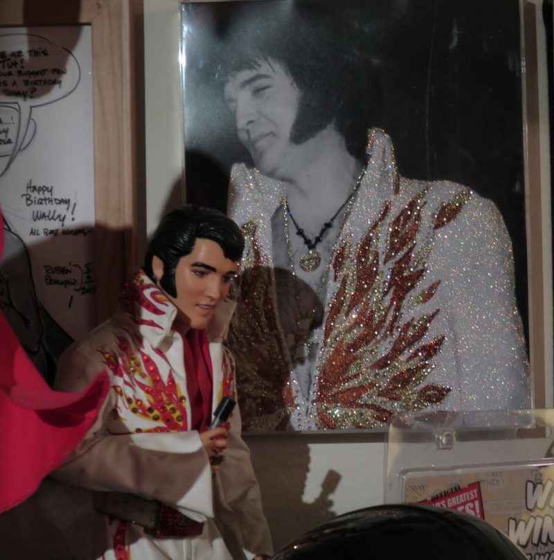 My pal Bruce Kulick, one of the greatest rock guitarists in the world, has been quite busy over the past year managing his merchandise business. And his wife Lisa Lane Kulick has her own business where she embellishes photos with “bling.” A while back, she gave me one of Elvis as a gift. I have it framed next to my Robo-Elvis robot. But I ordered this one from her recently because I’ve always loved Elvis’ “Flaming” jumpsuit, and I love this photo. Here’s how it looks all framed up and placed next to my “Flamin’ Elvis” figure. Here’s Lisa’s website in case you want to have her do some artwork for you! Lisa’s Vintage Glamour Creations items – BruceKulick.com – The Official Bruce Kulick Website
