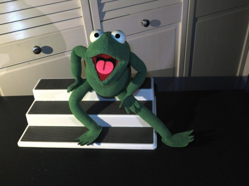 Thursday the 21st – FOAM FUN – OR – MOUSSE MANIA! – I fed the kids in the early evening and Michelle applied Roxy’s medicated foam to her underside. We did a quick pick-up shot for the Robin the Frog video for the end. Michelle had Gonzo and I had Kermit. There’s no audio required, as it was just a simple reaction shot. Michelle helped me record a Cameo video for a fan of “Tiger and Bunny” and that was a lot of fun! But it was time to get Michelle to the airport for her flight back home. We stopped at Jack In The Box to get some food on the way, as is our tradition. When I got home I had a ton of auditions to record. I also spent quite a while cleaning and straightening up the house. I realized with horror that the reaction shot we did with Kermit and Gonzo earlier was wrong. They were facing the wrong way and it wouldn’t edit into the piece well. I thought it might be possible to “flip” the shot, but there were lobby cards in the back with lettering on them, and a flipped shot would have looked odd, since all the lettering on the cards would be backwards. So I set up the camera and the lighting again, got the puppets out and put one on each hand. I got the shot I needed and sent all the materials to my pal Scott for the final edit. Whew! What a productive day!