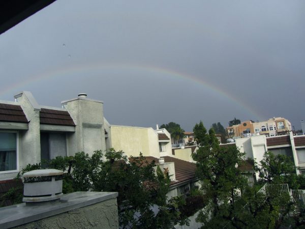 Sunday the 26th – RAIN! THUNDER! A RAINBOW! – Since Brittney’s plane was coming in around noon I wasn’t able to do my usual “sleepy Sunday” routine and veg out all day. I had to get up and get moving! As I worked I heard some large thunderclaps. It was really nice! It heralded the onset of another rainstorm! By the time Brittney got to my house it was around 1, so we sat around and got caught up on everything that’s been going on in life since I had seen her last. I was in Dallas for a convention last spring and had seen her and her sister then, but she hasn’t been in L.A. since the last Xena convention about a year ago. I put fresh sheets on the bed in the Puppet Room and she got situated. As I worked in my room I looked out the window and saw a gorgeous rainbow in the eastern sky! LOVELY! My gal Angi would be coming over for dinner later so I did some work while Brittney grabbed a quick nap. When Angi arrived I had to make sure that Spook was distracted so he wouldn’t notice that Angi’s dog Khloe was there. In his old age Spook has taken to marking spots around the house when he sees another animal, so I’m trying to prevent that by distracting him while Angi moves Khloe upstairs to my room. Once we had the pets separated we headed to Little Toni’s for dinner. The idea was that we would sit on the patio at Paty’s and watch it rain on the boulevard while we ate. But it wasn’t raining at that time, so we made alternate plans. Later it had started raining pretty good, so a WOG wasn’t possible.