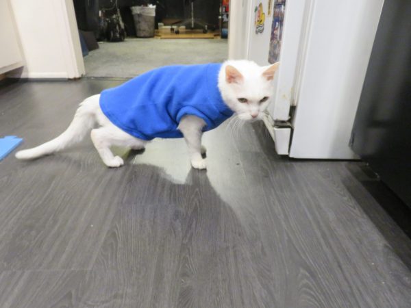 Tuesday the 21st – ENOUGH! – My eyes sprang open after only a few hours of sleep and I was ready to tackle the day. I had enjoyed enough sleep over the weekend. It was time to get busy! It was another gorgeous L.A. day. I stopped by my box to get some packages, hit the Burger King drive-thru to get some lunch, and then I went to Hobby Lobby to stock up on supplies for my photo album project. I was in luck! They had several of the binders that I like, so I picked up four of those. They also had lots of the blank pages and plastic page protectors that I like, so I really stocked up! I stopped over to my auxiliary garage and put the new registration sticker on the license plate of my Gran Torino. I noticed that the car covers for both the Torino and the Mustang were all mussed up, and the cable that locks the car cover onto the Torino was lodged behind a part of the lower trim. What had happened?! Then it hit me. My auxiliary parking spaces are in a complex that’s about four stories up, and there are large openings on either side. This allowed for those tremendous winds we recently experienced in L.A. to whip through and cause havoc. As I was working away one of the employees came through and said that other car owners had experienced trouble with their car covers as well because of the wind. He said one owner had to call out a specialist, as the wind had whipped his car cover around so violently that it actually got wrapped around the rear axle of the car! Unreal! I got the Mustang started up and parked the Rav temporarily. Within the next few days I have to get it “smogged” (the biennial requirement to get the car smog checked in order to get it registered) so I can update its registration. There are a few really beautiful days coming up, so it’ll be good to drive around with the top down! I went back home to relax and open my packages. One of them contained the new blue sweater for my cat Spooky. Since he’s 19.5 years old he’s mostly skin and bones now, with hardly any body fat on him at all! So I’m hoping this sweater will help keep him warm. I put it on him and everything was going well, but as I was sitting at my computer I heard a “thunk” coming from the downstairs bathroom. I went in and found that Spook had tried to jump into his litter box, but he had gotten tangled up in the sweater and couldn’t make the leap effectively. So I pulled the sweater off so it wouldn’t inhibit his already-limited flexibility. Poor little cat. I recorded my nightly auditions, typed out Wally’s Week, and then suited up to go take my nightly WOG (walk/jog). I came back inside to finish up Wally’s Week, went through my personal bank statement and got everything reconciled, and went through my receipts. What a successful day!