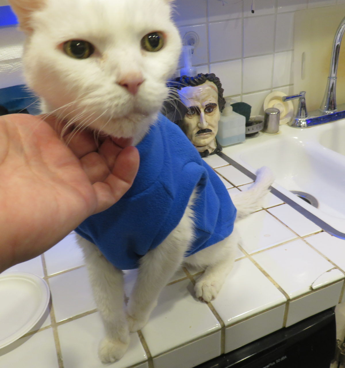 Tuesday the 21st – ENOUGH! – My eyes sprang open after only a few hours of sleep and I was ready to tackle the day. I had enjoyed enough sleep over the weekend. It was time to get busy! It was another gorgeous L.A. day. I stopped by my box to get some packages, hit the Burger King drive-thru to get some lunch, and then I went to Hobby Lobby to stock up on supplies for my photo album project. I was in luck! They had several of the binders that I like, so I picked up four of those. They also had lots of the blank pages and plastic page protectors that I like, so I really stocked up! I stopped over to my auxiliary garage and put the new registration sticker on the license plate of my Gran Torino. I noticed that the car covers for both the Torino and the Mustang were all mussed up, and the cable that locks the car cover onto the Torino was lodged behind a part of the lower trim. What had happened?! Then it hit me. My auxiliary parking spaces are in a complex that’s about four stories up, and there are large openings on either side. This allowed for those tremendous winds we recently experienced in L.A. to whip through and cause havoc. As I was working away one of the employees came through and said that other car owners had experienced trouble with their car covers as well because of the wind. He said one owner had to call out a specialist, as the wind had whipped his car cover around so violently that it actually got wrapped around the rear axle of the car! Unreal! I got the Mustang started up and parked the Rav temporarily. Within the next few days I have to get it “smogged” (the biennial requirement to get the car smog checked in order to get it registered) so I can update its registration. There are a few really beautiful days coming up, so it’ll be good to drive around with the top down! I went back home to relax and open my packages. One of them contained the new blue sweater for my cat Spooky. Since he’s 19.5 years old he’s mostly skin and bones now, with hardly any body fat on him at all! So I’m hoping this sweater will help keep him warm. I put it on him and everything was going well, but as I was sitting at my computer I heard a “thunk” coming from the downstairs bathroom. I went in and found that Spook had tried to jump into his litter box, but he had gotten tangled up in the sweater and couldn’t make the leap effectively. So I pulled the sweater off so it wouldn’t inhibit his already-limited flexibility. Poor little cat. I recorded my nightly auditions, typed out Wally’s Week, and then suited up to go take my nightly WOG (walk/jog). I came back inside to finish up Wally’s Week, went through my personal bank statement and got everything reconciled, and went through my receipts. What a successful day!