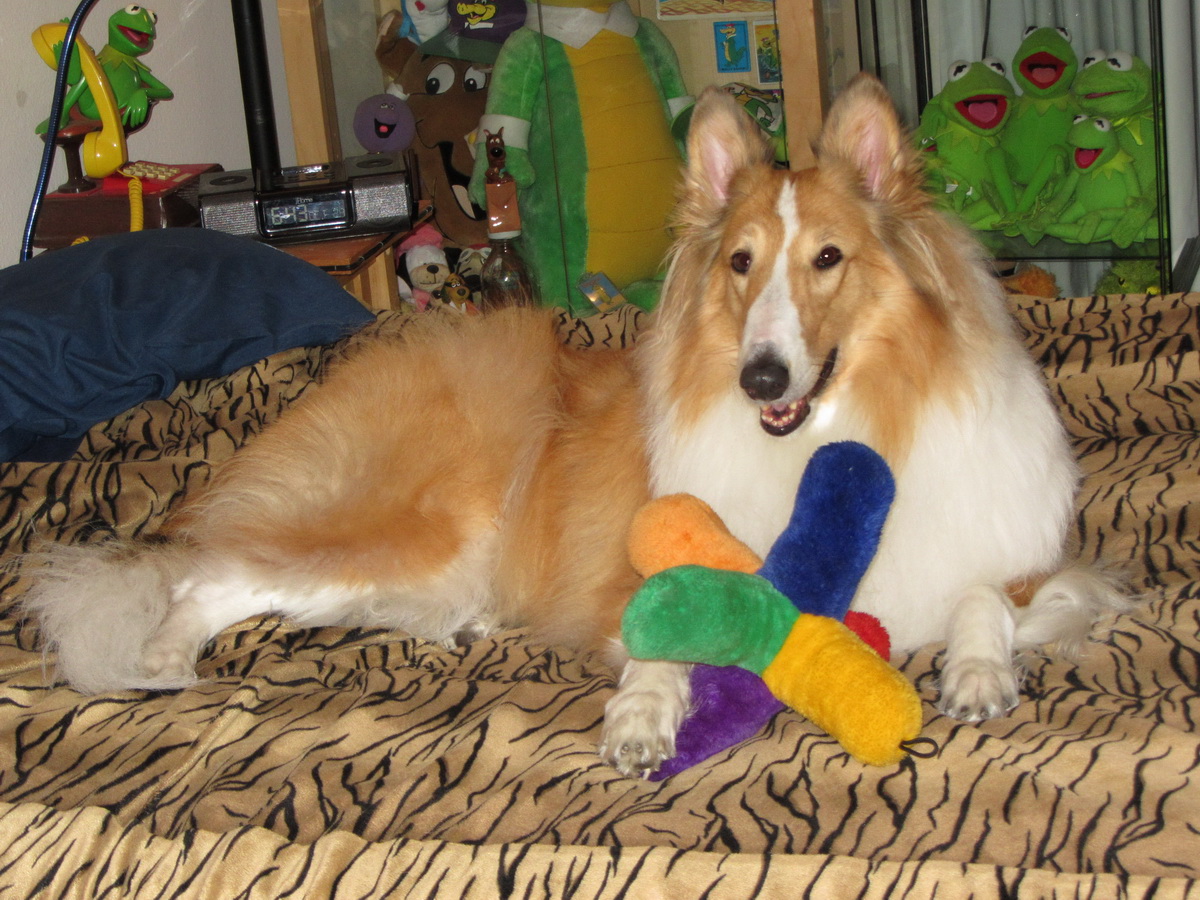 Roxy’s very at home with her toy on the Puppet Room bed.