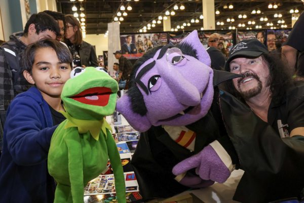 Sunday the 28th – PASADENA COMIC CON! – After getting up fairly early to get ready I got completely prepared for the day. Though the convention started at 9am I didn’t feel the need to be there until about 11 or so. Adam West always told me that he liked to arrive a little late to a convention to let a little crowd build up. Nothing’s worse than going in and sitting there at your table alone for a while. My pal Officer Mark came over in his brand new SUV and we packed it up with my stuff. We had a great drive to Pasadena, got parked and went into the convention around 11 on the dot. One of the first people I saw after I checked in was my pal Maggie, who guided me to my table to help me get set up. My assistant for the day Kraig was all ready to help out and get us going. There was a small line already formed and we hit the ground running. After about an hour I met a nice couple, and I commented on how much I loved his girlfriend’s mode of dress; very gothic. She was dressed all in black with a batwing purse! I just knew that was the perfect opportunity to bring out Count Von Count 2.0! We got some fun pictures and goofed around with some of the people in line. My gal Angi arrived at the convention and sat in our area to observe. My pals Alex and Mike from Alex in Wonderland arrived with a special gift that we were going to present to Sid Krofft later. Sid helped to create many of the Saturday morning shows I loved as a kid, and most of them involved puppets. Some friends of Officer Mark’s arrived, and their son is an avid Kermit and Muppet fan. He brought Kermit up to my table to chat with me. Then I brought out Count Von Count and the two chatted like the old pals they were. It was great fun, and it’s especially wonderful to see a young, aspiring puppeteer. When there was a break in my line I texted Mike and met him at Sid Krofft’s table. Mike has the molds for one of the original Sleestak headpieces that were used in the show that Sid co-created called “Land of the Lost.” We made up a copy for him and put it on a really neat base. Sid was absolutely blown away! I saw a lot of my favorite people at the convention; both Voice Actors and con-goers alike. It was a marvelous day! Angi and I got a chance to walk around and do a little shopping. The con ended at 5 and I stayed until the very end. Then Officer Mark and I headed to Paty’s, followed by Angi in her car. We had a fantastic dinner on the patio as we all “came down” from a very hectic, but FUN day. Angi brought me home and I went inside to relax, unwind and unpack. Later I did some auditions, and took my nightly WOG. Afterwards I sat in the anti-grav chair and marveled at the gorgeous, clear night. The weather was still pretty nice and I enjoyed some beautiful meditation time out in the peace and quiet. I came back inside and made some tomato soup and a sandwich and watched another episode of “Boris Karloff’s Thriller.” What a fantastic week filled with friends, food and fun!