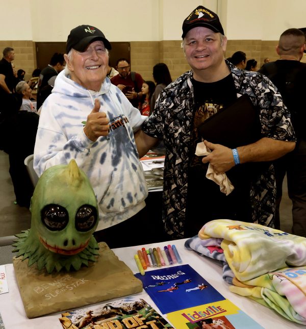 Mike McGee presents Sid Krofft with a copy of an original Sleestak headpiece from Sid’s show “Land of the Lost.” Sid LOVED it!