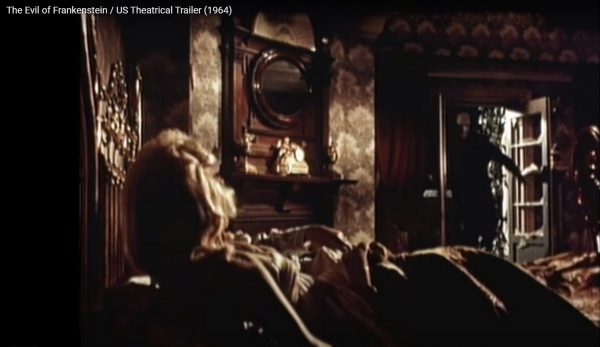 One of the earliest memories I have from childhood are the times I spent with my folks at the drive-in movie theater. My mom and dad would make up a little bed for me in the back of the car, cook their own popcorn and go to the movies. One early memory I have is hearing the song “Michelle” by the Beatles on the speaker before the movie started. I remember liking the song quite a bit. Another “less pleasant” memory I have is seeing a very scary scene on the screen that has haunted me since I was 3 years old. I’ve always carried the image with me of a woman taking a bath on the left side of the screen (facing the camera), while a green Frankenstein stood in a doorway behind her on the right side of the screen. I remember feeling that she was so vulnerable and had no idea he was behind her. I always wondered what movie that mental image was from. But a few weeks ago Svengoolie on ME-TV ran the 1964 movie “The Evil of Frankenstein” starring Peter Cushing. When I saw clips from that movie I realized that this might be the movie! The Frankenstein monster was large and green. I’m sure my folks didn’t see the actual movie at the drive-in, but the trailer could very possibly have run before the main feature. And that’s what I might have seen. Plus, the film’s 1964 release date would have definitely coincided with my early 3 year old memory. I got curious, so I looked at the trailer for the film on YouTube. VOILA! At about a minute into the trailer there’s a shot very similar to the one I remembered! Except the girl is not in a bathtub, but rather in bed. But she IS on the left side of the screen looking very vulnerable. On the right side of the screen a giant green Frankenstein monster crashes through her bedroom door. This could be the very shot I’ve been remembering, and I think it most likely is. I’m glad to have finally found it after all these years, so I ordered the film on Blu Ray and I’ll be watching the whole thing soon!