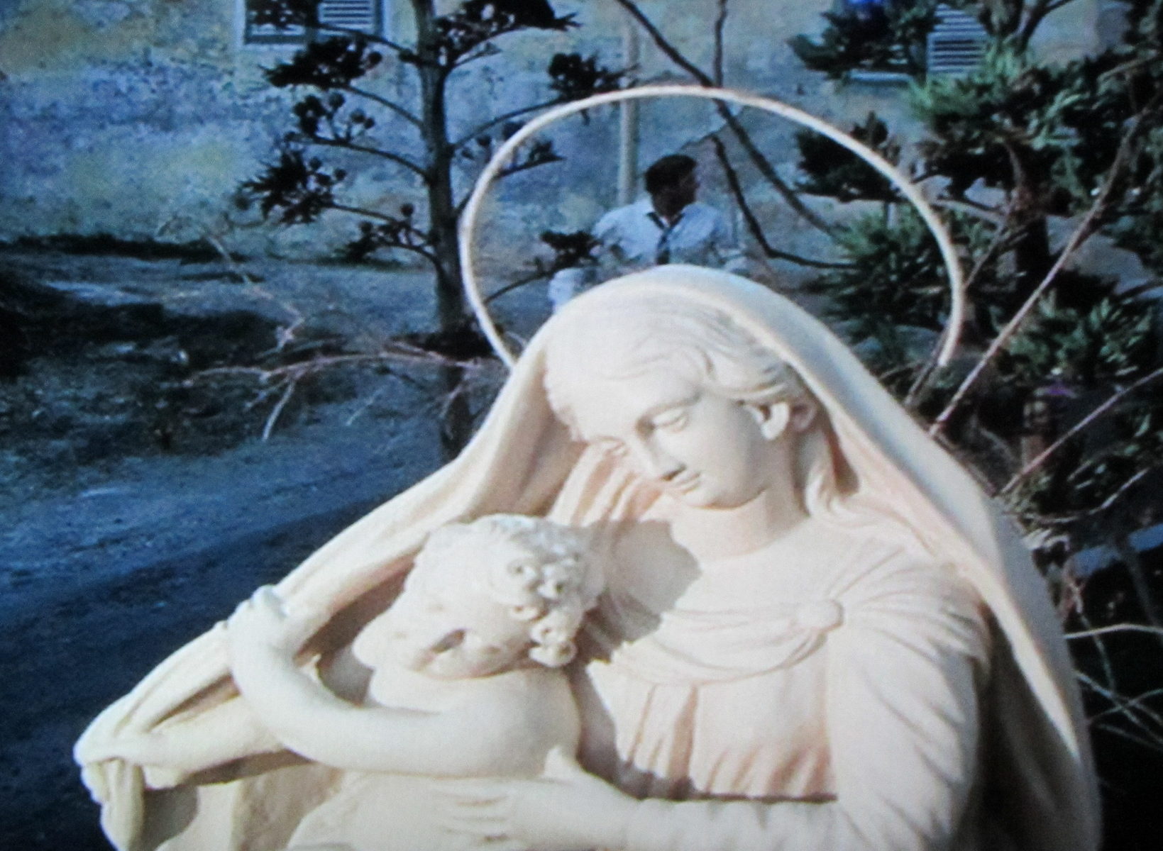 When I saw this shot in the episode of “The Saint” last Friday I literally clapped in admiration. Roger Moore as Simon Templar aka The Saint is perfectly framed in the halo of a Mary statue. Brilliant shot!