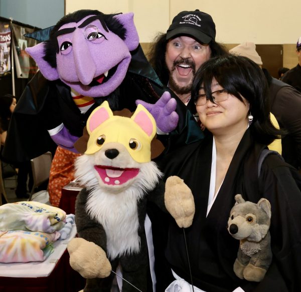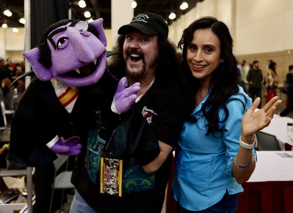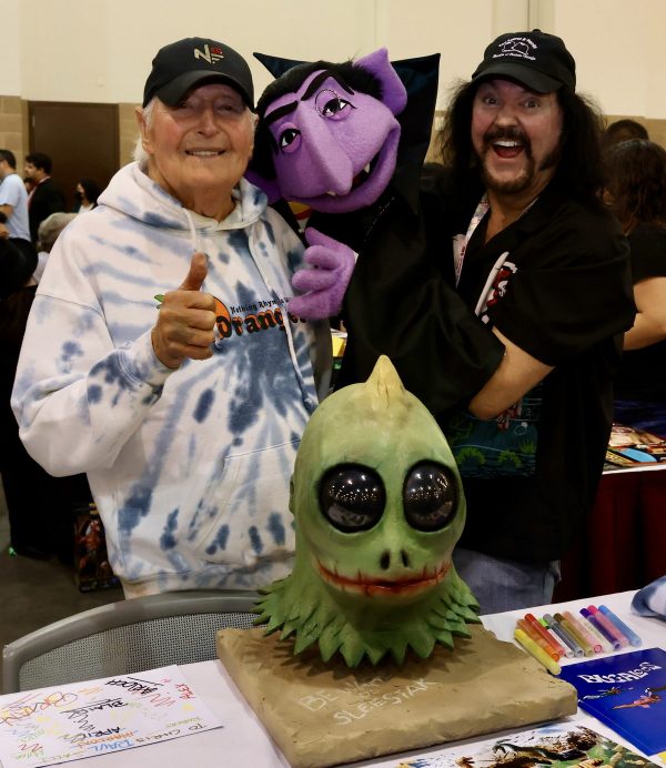 Sunday the 28th – PASADENA COMIC CON! – After getting up fairly early to get ready I got completely prepared for the day. Though the convention started at 9am I didn’t feel the need to be there until about 11 or so. Adam West always told me that he liked to arrive a little late to a convention to let a little crowd build up. Nothing’s worse than going in and sitting there at your table alone for a while. My pal Officer Mark came over in his brand new SUV and we packed it up with my stuff. We had a great drive to Pasadena, got parked and went into the convention around 11 on the dot. One of the first people I saw after I checked in was my pal Maggie, who guided me to my table to help me get set up. My assistant for the day Kraig was all ready to help out and get us going. There was a small line already formed and we hit the ground running. After about an hour I met a nice couple, and I commented on how much I loved his girlfriend’s mode of dress; very gothic. She was dressed all in black with a batwing purse! I just knew that was the perfect opportunity to bring out Count Von Count 2.0! We got some fun pictures and goofed around with some of the people in line. My gal Angi arrived at the convention and sat in our area to observe. My pals Alex and Mike from Alex in Wonderland arrived with a special gift that we were going to present to Sid Krofft later. Sid helped to create many of the Saturday morning shows I loved as a kid, and most of them involved puppets. Some friends of Officer Mark’s arrived, and their son is an avid Kermit and Muppet fan. He brought Kermit up to my table to chat with me. Then I brought out Count Von Count and the two chatted like the old pals they were. It was great fun, and it’s especially wonderful to see a young, aspiring puppeteer. When there was a break in my line I texted Mike and met him at Sid Krofft’s table. Mike has the molds for one of the original Sleestak headpieces that were used in the show that Sid co-created called “Land of the Lost.” We made up a copy for him and put it on a really neat base. Sid was absolutely blown away! I saw a lot of my favorite people at the convention; both Voice Actors and con-goers alike. It was a marvelous day! Angi and I got a chance to walk around and do a little shopping. The con ended at 5 and I stayed until the very end. Then Officer Mark and I headed to Paty’s, followed by Angi in her car. We had a fantastic dinner on the patio as we all “came down” from a very hectic, but FUN day. Angi brought me home and I went inside to relax, unwind and unpack. Later I did some auditions, and took my nightly WOG. Afterwards I sat in the anti-grav chair and marveled at the gorgeous, clear night. The weather was still pretty nice and I enjoyed some beautiful meditation time out in the peace and quiet. I came back inside and made some tomato soup and a sandwich and watched another episode of “Boris Karloff’s Thriller.” What a fantastic week filled with friends, food and fun!