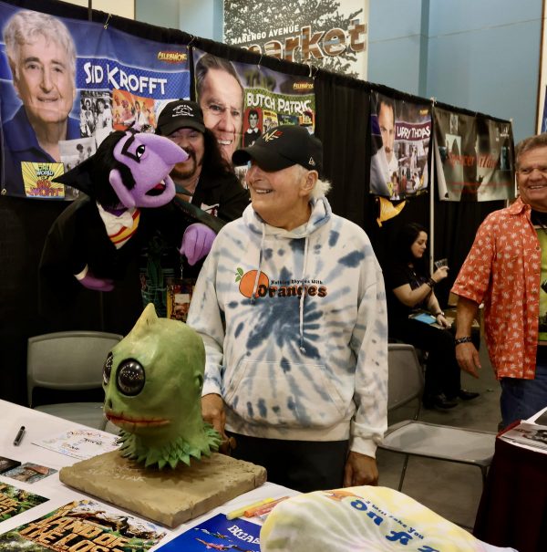 Mike McGee presents Sid Krofft with a copy of an original Sleestak headpiece from Sid’s show “Land of the Lost.” Sid LOVED it!