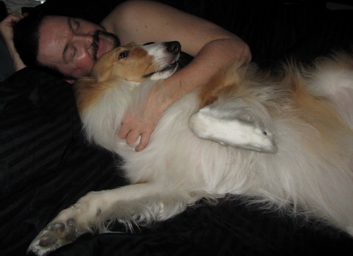 Roxy just adores “cuddle time,” and even knows the word “cuddle.” She’ll get up on the bed next to me and wait for me to say, “Do you want to cuddle?” Then she’ll lazily roll over on her side with a moan and wait for the pets to begin!