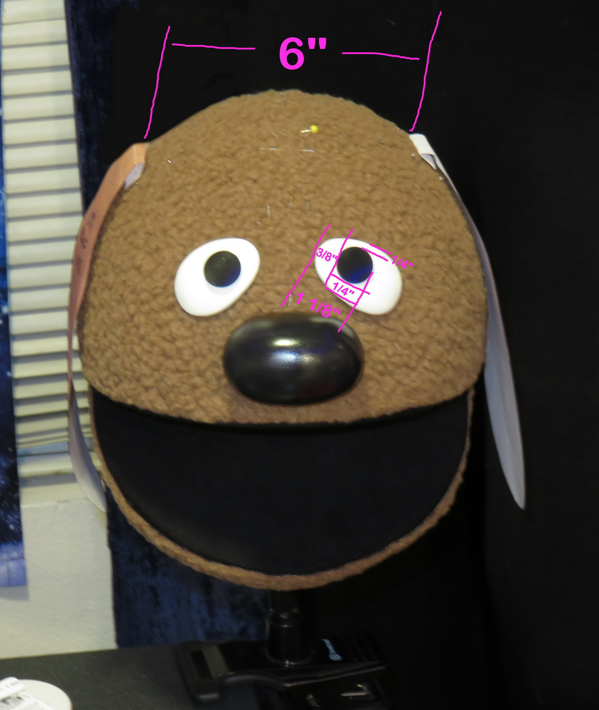I’m starting to work out the proper spacing on the eye pieces for my 10% Rowlf replica Muppet. I ordered a hole punch from Amazon so I can punch out the perfect 3/4″ hole out of black velvet for the pupils.