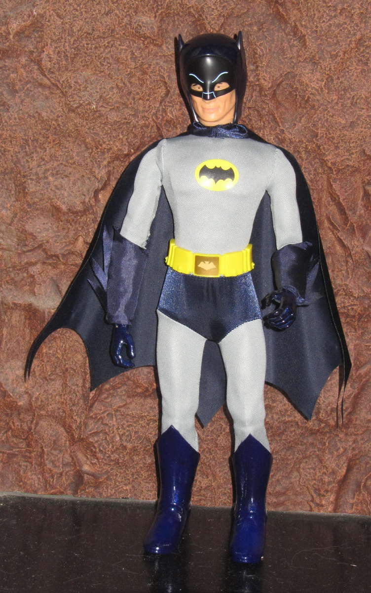 This is a vintage 1966 Captain Action figure wearing a Batman costume from a new Ken doll. I didn’t much care for the Ken doll, so I made some changes to the costume and put it on Cap. Nice fit! This may be have been what a Batman TV series costume would have looked like on Captain Action back in the 60’s!