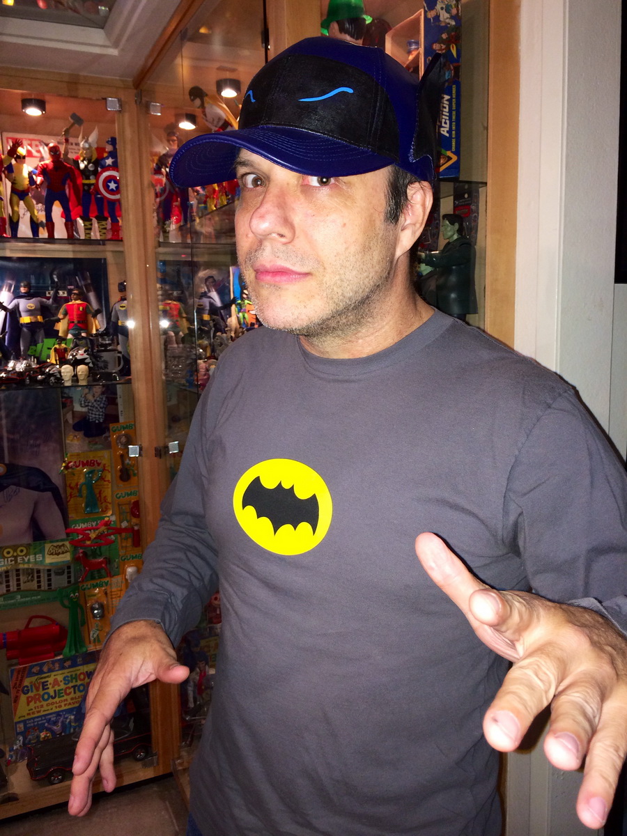 Tuesday the 15th – PRE-CON CALM! – Around 1pm my assistant Sara came over to pick up some of my 2014 Voice-Over Promo Kits to mail out. I had just received some more last-minute addresses from my agent and I wanted to get them right out. Then I headed to my seamstress Karyn’s studio to pick up some stuff I’ll need for the upcoming San Diego Comic Con. I also dropped off some more stuff for her to work on. I had her re-sew the stitching that had unraveled on my Minnesota Twins jersey, and I picked up a couple of finished bat caps. One I would be giving to my pal Scott Sebring for a late birthday gift, and the other I was going to send to Adam West. Knowing his sense of humor, I thought he’d like it. On the way home I stopped at the hardware store and picked up some silver metallic paint. While doing the lining of the hat for my Tin Man bust, I scraped a little bit of the paint on the exterior. So I need to repaint the entire thing so it all matches. I got home and fed Spook and gave Roxy a snack, then got ready for dinner at Barone’s with my old pal Mark Evanier. It was the calm before the storm, because Mark is always in a whirlwind at Comic Con, darting from panel to panel and riding herd on the Special Guests. It was fun to just relax, eat great food, and chat about his plans for next week’s San Diego Comic Con. When I got home I set about working on several projects. One of them included painting the famous blue eyebrows on the bat caps. It was very time consuming, but I wanted to make sure they were done right. I also had several auditions I needed to record and e-mail into my agents. I fed Roxy and gave Spook a snack, then hit the hay. No TV time tonight…I was just too exhausted!