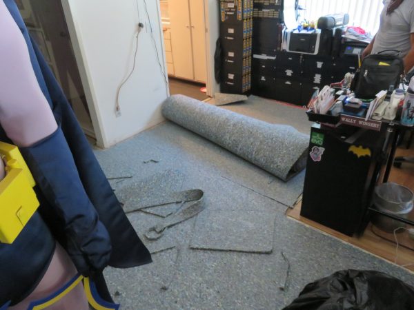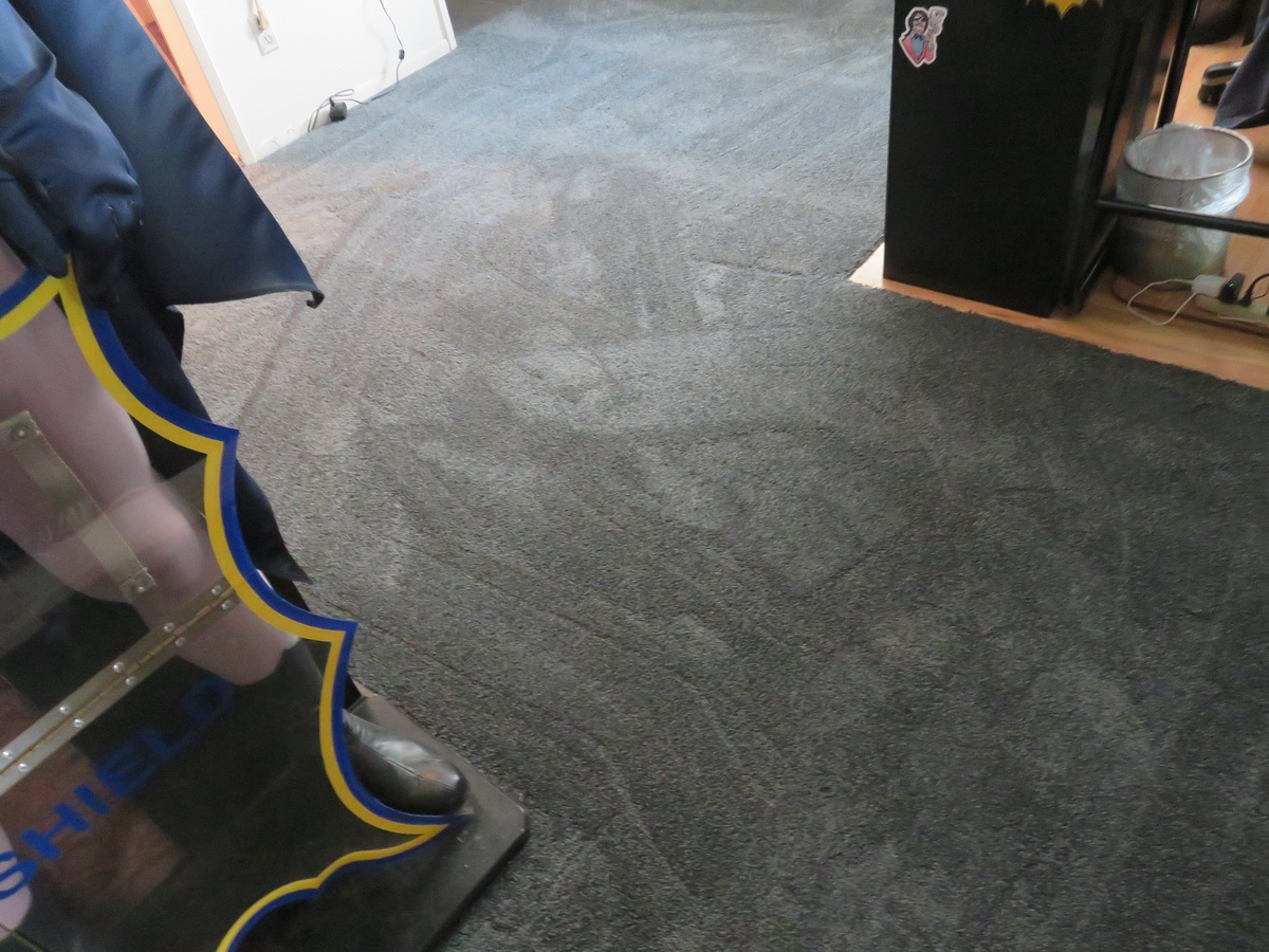 Monday the 15th – CARPET CRAZY! – After only 3 hours of sleep, my pal Chris Malmin came over at 8:30 to help me move some things out of my living room so the carpet could be replaced in the home theatre and the showcase areas. The carpet guys arrived at that time too, so we had to work fast! First job was to move my giant Sulley figure from “Monsters, Inc.” out to the patio. But he was too big to fit through the doors initially, so we removed his arms. When the huge Styrofoam-and-fur figure was delivered to my house initially in 2001 that’s how he had to be brought into the house. There are little pegs that slide down into the shoulders to hold his arms on, and his arms have PVC piping with pop-out buttons on them to hold them into place. We tugged hard and finally the arms came off. We put the arms on the sofa, and the main figure was taken outside to the patio and wrapped in plastic. Then it was Robo-Elvis’ turn. He was pretty simple to move, comparatively, as he’s all one piece. Once he was moved to the patio he too was covered in plastic. I didn’t want dirt getting on him in case the landscaping guy came by to clean up with the leaf blower. I also didn’t want birds flying over and leaving their little gifts on my valuable pieces. Once the living room was clear the carpet guys started working down there. They tore up the old carpet and quickly disposed of it. The carpet was original to the house when I bought it back in 2000. It was in great shape then so I didn’t see any reason to replace it. But after 19 years of constant traffic in Planet Wallywood, replacing it was long overdue. Chris and I moved to the showcase level to remove a movable case to the kitchen. It was obvious that the stuff inside was going to toss, turn and tip, but we didn’t care. I just wanted to get it out of the way for the new carpet, and I’d clean it up later. I told Chris I’d call him later after they finished and we could replace everything, and I’d buy him lunch. In the meantime, I took the “very confused” pets upstairs to my room to get them out of the way. Roxy was cool with it, but Spook was going nuts trying to get out of my bedroom. He wanted to go see what was going on, but since they were carting the old carpet out, and bringing the new carpet in, the door leading to the garage and the back entrance had to stay open constantly. I didn’t want to risk having him run outside and get lost. He got so belligerent that I had to get his “squirt bottle” and threaten to squirt him with water if he started to become too much of a pain in the neck. He was meowing and being very obnoxious, not understanding why his run of the house was being temporarily limited. I did manage to get a little sleep when I opened the bedroom curtains and let the morning sun beam in. Spook settled down in the sun and nodded off for a while. As they originally estimated, the carpet guys finished at 2. They were masters of their craft! I paid the balance of the cost and then called Chris to swing over. While I waited for Chris I cleaned the patio doors top to bottom. They hadn’t been cleaned in many years, since I never use them. Normally I can’t get to them because I have displays in the way. But this cleaning was going to have to suffice for a very long time, so I made sure to clean it well! When Chris arrived we moved Sulley and Robo-Elvis back in. The wind had come up in the early afternoon and had blown most of the plastic off. Luckily no dirt or birds managed to…ahem…”sulley” them. I vacuumed Sulley’s fur just to make sure. We moved the showcase back into place and I noted that I was going to have a lot of work to do on it. Not only did I have to repose the majority of the figures inside, but it needed a good cleaning; top to bottom! Then Chris and I took off for a late lunch at Jerry’s Famous Deli. When I came home I got to enjoy a lot of quiet, and of course all this luxurious new carpet! It matched my new flooring in the kitchen very well! I did some auditions and grabbed a ‘real’ nap. I got up later to type out Wally’s Week. I made a pot pie and watched another episode of “The Mod Squad” before bed. Whew! What a day! But worth it!