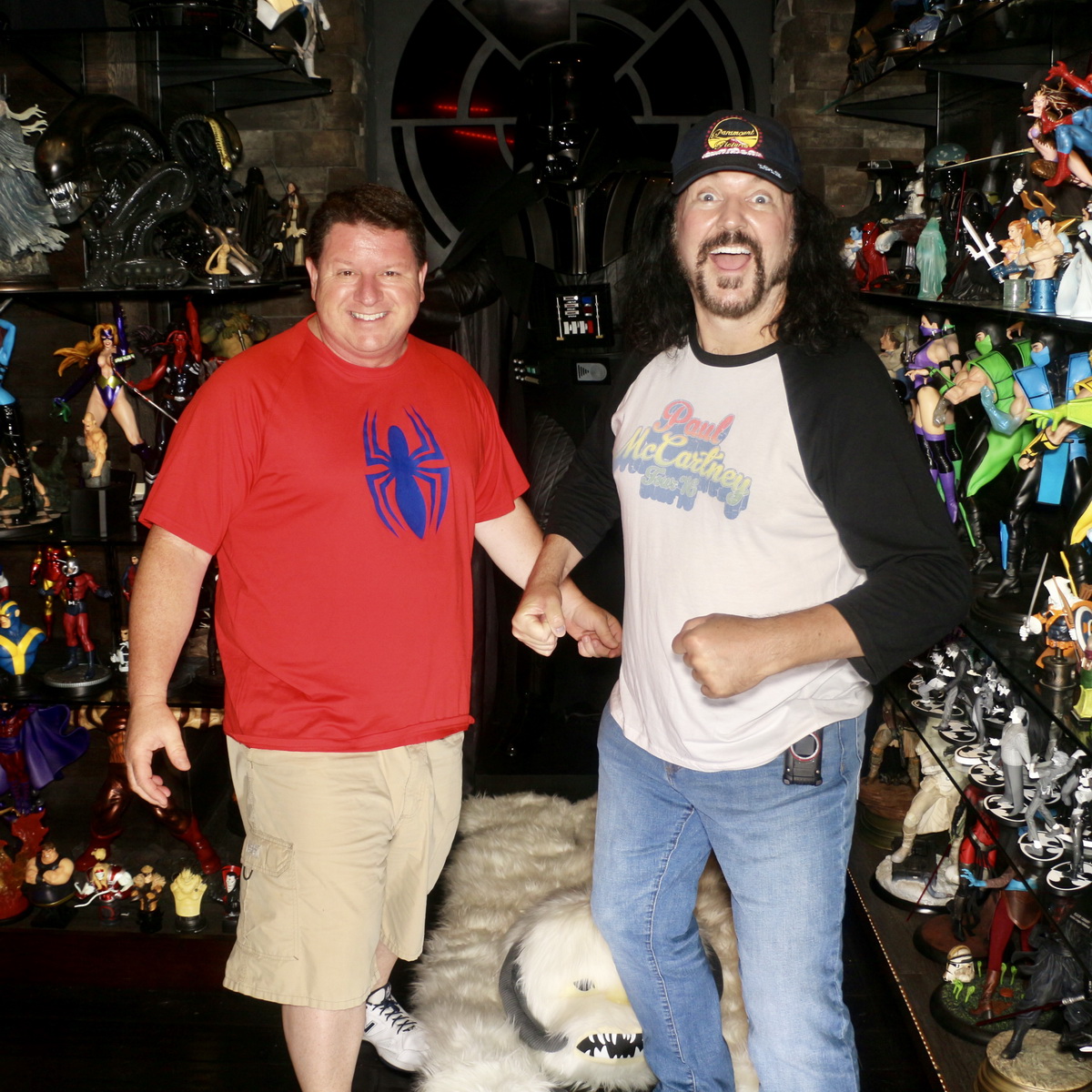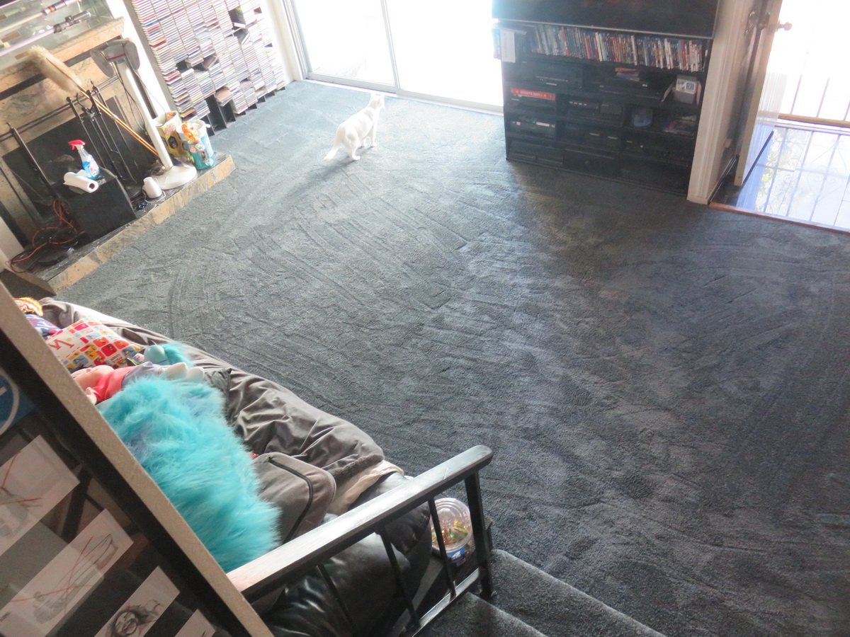 Tuesday the 16th – REORGANIZING THE DISORGANIZATION! – Because I was so exhausted from the previous day, I slept until 3 in the afternoon. I worked around the house and called our local sanitation department to have my old dish washer taken away by their ‘bulk pick-up’ folks. I also called the hotel I’d be staying at in Sioux Falls for my upcoming trip to see how early I’d be able to check into my room. I was taking a red-eye flight from L.A. to Sioux Falls, and though I knew I probably wouldn’t be able to check in when I landed at 10, I would have been totally happy to be able to check in at noon, or thereabouts. But when I called the Hilton number I kept getting a person in what sounded like Pakistan. I wanted to get the hotel in Sioux Falls directly, but even after I called back it still went overseas. So I called my folks and asked them to go to the hotel (which is near their house) and put my on with the local desk clerk directly. I finally got to speak with the local Sioux Falls desk clerk and she assured me they’d do everything in their power to accommodate me. I also discovered that my home landline wasn’t working. I’m not sure how long it’s been down, since I hardly ever use it, but because my cell phone service inside my house is so spotty, I need to have a landline for Voice-Over sessions. When I’m asked to record something in my home studio, I like to have the client on the line as I’m recording so they can direct me. I never use my cell phone because right in the middle of a conversation I’ll lose signal and BAM…they’re gone. So I called the phone company and filed a trouble ticket. Unfortunately the soonest they can get out is the following Tuesday, and I’ll be out of town. I’ll instruct my housesitter to handle it. But it’s lousy service like this that makes me want to lose the landline altogether. I did some more cleaning and reorganizing in the living room and the second floor. The new carpet looked amazing, but it would take a while to get everything put back the way it was. I did some auditions that came in as well. I had to break for a bite, so I met my pal Sara over at Coral Café for a good meal. Then I came home to put the living room back in order. I cleaned up Robo-Elvis, got him plugged back in and positioned properly. Then I put Sulley’s arms back on, combed his fur, sprayed it with hairspray so it would stay in position, and wired him up so he would continue to stand upright. Since the figure is almost 20 years old, and has an exclusively Styrofoam inside, the Styrofoam has fatigued over the years and he was slouching quite badly. But I figured out a way to wire him up in the back so he would always stay erect and looking like he did when I first bought him. I brought his partner Mike back down from the Chaney Room and put him back in place as well. I brought the Andy Kaufman “Heartbeeps” figure downstairs again and put him back in to position. When I made a new mannequin, I try to remember to put duct tape on all of the joints so it won’t come apart in pieces every time it’s moved. I completely taped up the “Heartbeeps” figure just before I took it to “Monsterpalooza” last April, so it was pretty easy to move. It was now one solid piece with no moving parts. But the best way to move those mannequins is by grabbing them by the crotch and butt with both hands and lifting them. It looks very odd if someone happens to be passing by and watching! Exhausted, but happy with my progress, I grabbed a short nap. I got up later to fed the kids, did some more auditions, and finished up my work in the living room.