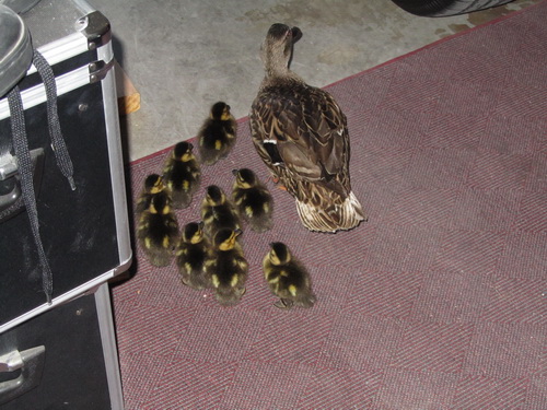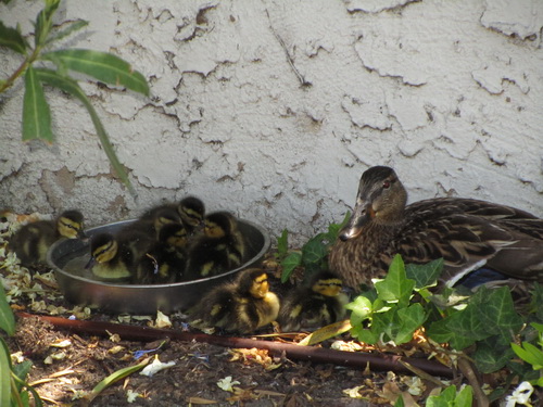 Monday the 8th – A DUCK DAY AFTERNOON! – I got up around 11 to let Electric Bob and his minion Ernie in to work on the bathroom, and they informed me that I had a mother duck and ducklings in my garage. Apparently when they opened the garage door she went inside looking for shade and shelter. At first I thought it might be the duck that visits my pool every February, so I ran down to see. There she was, right by my feet, unsure of what to do. She was with her 9 babies, and I was worried they’d get trampled underfoot with all the activity going on in my garage. So I grabbed my camera and followed them outside into the hot day. I coudn’t tell if it was the same hen that visits me each year in February, but I made my duck noise and she didn’t respond in the usual way. (When I make a quacking sound to the duck couple who make the annual trek to my pool, they perk up their necks and start approaching me, since they know it’s time for a snack.) I also fed them some peanuts and she didn’t seem interested. (The hen who normally visits me LOVES peanuts!) They settled in an area by one of the units in my complex that offered lots of shade and shelter. I didn’t know what to do or whom to call to try and get them replaced in their nest. Apparently my neighbor Byron had seen them wandering around on the upper deck of the L.A. wash and herded them on to the property so they wouldn’t get eated by an overzealous dog. The upper deck of the wash often has unleashed dogs trotting along with their owners, but sometimes the owners don’t keep a very sharp eye on their canine charges. It was my though that their nest must be on the lower deck of the wash, down by the water. And somehow they walked up to the second level and couldn’t find their way back down. I brought out a pie pan filled with cool water and some bread. She didn’t seem interested in the bread, though she ate a little of it. I walked away, but came back 15 minutes later. When I did all 9 babies were in the water splashing around and having a grand ol’ time. They all got a drink and seemed happy. When the babies finished their bath they settled down by mom and picked at the surrounding foliage to see if there was anything good to eat. I went back inside and heard a horrible sound. The guy with the leaf blower! OH NO! I went out to check on the ducks and only saw the pan of water full of dirt and leaves. He had been there. The ducks though, were nowhere to be seen. I spoke to the leaf blower guy and he said he came upon them completely by surprise. In fact, he was probably more surprised than the ducks were! He said all 10 ducks hightailed it up the steps to the next level. I ran up and found them huddled behind a hedge. I had to get to work, so I called my friend Byron from the complex who initially found them. I told him I suspected their nest was down below by the water, so he brought over a pet carrier to try and crate them up for relocation. But when we went back to the area where they had last been seen…nothing! They had moved on. He continued to look while I went to work. I got lunch at Weinerschnitzel and headed to work, and while we taped “The Tonight Show” I worked on finishing up Wally’s Week from last week, which entailed the adventures during my recent South Dakota getaway. During the taping Byron called and said he found the ducks, lured them into the carrier with some bread and water, and relocated them to the lower level of the wash. I hope they’ll be alright. But I’m sure they’re closer to their nest than before! On the way home I picked up some mail at my mailbox, which included the Fed Ex’d box I sent from the hotel in Sioux Falls. I got home and continued working on Wally’s Week, which was starting to feel like a novel. I took a relaxing dip in the pool and Jacuzzi, and then came back in to finish it up. My assistant Sara met me for a late dinner at Jerry’s Famous Deli. A whole week in South Dakota and I only had ONE salad! Baaaad Wally! So I really needed one of Jerry’s salads. I came home to do more work, and then I hit the hay!