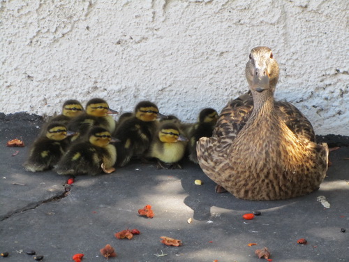 Mama duck and her 9 ducklings grab some shade on a hot day.