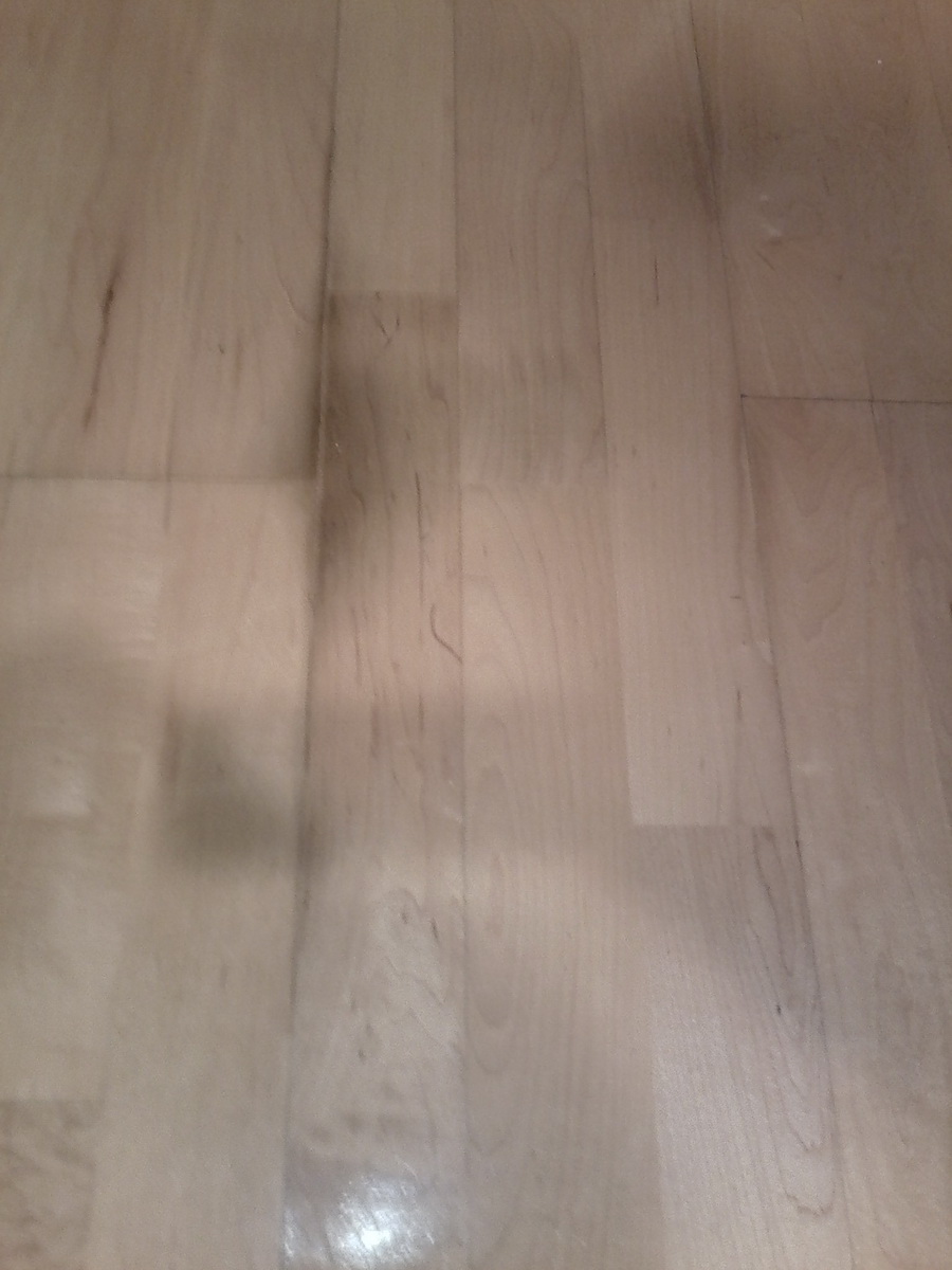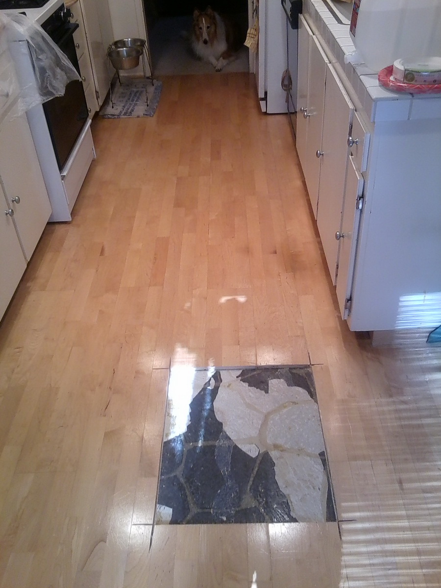 At first the offending square of wood flooring is extracted from my kitchen floor and examined. As you can see the old linoleum is clearly visible underneath the wood!