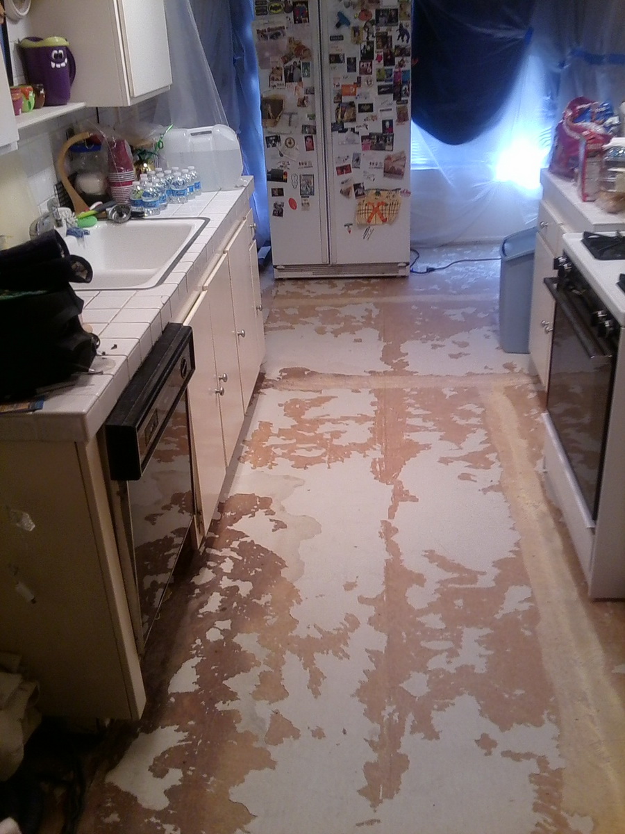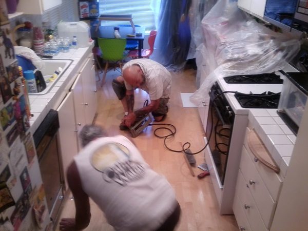 Tuesday the 9th – CHA CHING! AGAIN! – At 9am sharp Handy Don and Greg the Flooring Guy arrived and started tearing up my floor. They had lots of plastic up so the dust from the demolition wouldn’t permeate my house too much. I went back to bed and let the guys work. When I got up at 3 the guys were gone, but my kitchen floor was completely torn up. They had to hit the lumber yard to get the appropriate quantity of quarter-round and begin to stain it so they could have it ready for the installation on Wednesday. I called him to see how it went. He said the following – 1) they discovered that when the wood flooring was laid originally, the old linoleum tile under it hadn’t been removed like it should have been. It should have been stripped completely to the floorboards. The wood was simply laid OVER the linoleum. So they had to remove all of that too. Big, nasty job – which put them behind schedule a bit. Since the wood flooring wasn’t lying flat on my floor, but rather had the layer of linoleum underneath it, it allowed water intrusion to go down the little alleys between the linoleum tiles (under the wood) and settle in a low spot in my kitchen – ie; the black spot. 2) When they removed all of that, they discovered that my old dishwasher had been leaking – the source of the water intrusion. There was a lot of visible staining on the floorboards in front of my dishwasher. I would need to get a new dishwasher too. CHA CHING! It just never ends! He said they were going to go to a store in his neighborhood that sold brand new appliances for cheap in a kind of ‘scratch & dent’ setting. The machines were all brand new, but there were little aesthetic blemishes that prevented them from being SOLD as perfect, brand new items. He said if I didn’t care that it had a little ding on the bottom of the front of the door, he could save me about $300. I told him if anyone would notice a small ding in my dishwasher door, given the fact that I have so much OTHER stuff to look at in Planet Wallywood, then I was doing something wrong. So it wasn’t as bad of a Cha Ching a I had thought, but still it was an added expense I hadn’t counted on. On a side note, I simply do not know what I’d do without Handy Don. He’s a valuable pal and construction resource and I appreciate his help. I had the evening open so I decided to go over to Floyd’s Barbershop for a touch up on my color and get a little trim. It was a nice night so I put the top down in the Mustang, put Roxy in the back and drove to Taco Bell to get some food. Then I went home to do my nightly auditions, type out Wally’s Week (which was a day late, given my construction issues) and finish up some things around the house. Then I got inspired to finish up a new kid’s story I had been working on for my kid’s project. By the time it was 7am I was pretty tired, but I had to be awake at 9 to let the guys in to start laying the flooring!