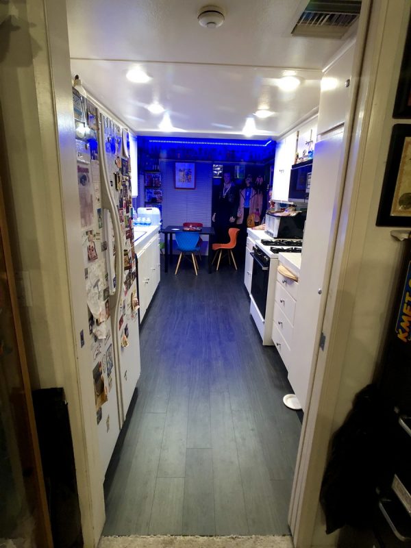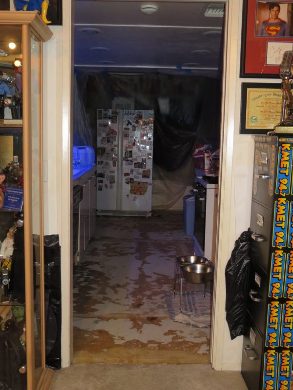 Wednesday the 10th – BREAKING AND ENTERING!? – Before I turned in at 7:30am, I phoned up Handy Don to tell him I was hitting the hay. I told him I’d leave the front door locks UNLOCKED, and he and Greg should just make their way in and start work, as I’d be upstairs passed out. After I hung up with him, I got out of bed and went downstairs to DOUBLE CHECK the locks on the doors to make sure they WERE unlocked. Once I’m in the Tranquility Zone asleep, there’s no reaching me. I don’t hear my phone and I don’t hear the doorbell. I remember waking up briefly and hearing them working downstairs, cutting the flooring. I went back to sleep until 2pm. When I went down to see them Handy Don jokingly said he’d have to charge me extra for breaking and entering. I didn’t understand. He said when he and Greg the Flooring Guy arrived the door was LOCKED and they couldn’t get in. Nor were any of their calls and shouting being responded to. So they put a long ladder in the back of Greg’s truck, Handy Don climbed up to my Puppet Room window (which thankfully was open!), removed the screen and got in the house that way. WHAT?! WHAT??!!! I told him I had checked and DOUBLE CHECKED that the door knobs were unlocked. I simply didn’t understand how they could have gotten locked! Good grief. ANOTHER pain in the neck to deal with this week. I told him I was very sorry he had to do that, but I just didn’t understand how that happened. The flooring was going in a lot more slowly than expected. The floorboards had to have a certain amount of patching done before the vinyl panels could be laid. This would minimize any future “low” spots in the floor. I spent the afternoon on the computer tweaking my new kid’s story that I spent all night writing. I monitored news on-line and hung out in case the guys had any questions. A few months ago I scheduled an appointment with my orthodontist’s office, and the appointment was for this very night at 8:30pm! (They do night time appointments occasionally for those people who work during the day) The office is VERY busy, and if I missed this appointment it would be another month or so before I could get in again. My dental appliance (retainer) no longer fit in my mouth because of the recent dental augmentation I had received. It needed to be reconfigured to fit and I wanted to make sure I could start using that as soon as possible. My teeth tend to move around a little bit without it. The guys had assured me that they would be all wrapped up by 7:45pm so I could make my appointment. The flooring was in and it looked fabulous, but the dishwasher wasn’t going in as smoothly as they had thought. While Greg the Flooring Guy cut and installed the quarter-round, Handy Don worked on the dishwasher. I called a few of my assistants to see if they could come over and sit with the guys while they finished, as it looked like they’d be here later than planned. But no response. Luckily, my pal Sara could come by for a few hours and hang with them while they finished up, and while I drove to the orthodontist’s office. I decided to de-stress on the drive over, so I got out the Gran Torino and had a nice drive on a gorgeous summer evening. Driving that car always mellows me out! I got to the appointment, everyone loved the car, I got to see the orthodontist’s staff, and it was determined that I would need a brand new appliance made. Altering the existing one would render it basically useless. So they took a new dental impression so they could get working on it. I paid the fee (CHA CHING!) and got in my car to head back. Sara texted to say they had just finished up at 10pm (!) and I told her to meet me at Jerry’s Famous Deli for dinner. When I walked in, I saw a beautiful sight! Everything was clean, things were put back in their place, and best of all – the flooring looked fabulous! Feeling a lot better about life, I sat down and recorded my nightly auditions, recorded my new kid’s story, did some work in the kitchen cleaning up, and got organized. Whenever there’s construction being done, despite how much plastic is hung, there’s always a thin layer of dust on everything. I gave the kitchen a once-over, with the intention of doing more detailed cleaning the next day. I was really glad that this week was slow work-wise, so I didn’t have a nutty work schedule complicating things. The week before the San Diego Comic Con, and the week during the San Diego Comic Con, and the week after the San Diego Comic Con are usually pretty slow. I’m sitting Comic Con out this year, and a good thing too, given all the work that’s being done around the house. That night I walked Roxy on our late-night stroll through the neighborhood and enjoyed a nice, relaxing cigar! With full intentions of sleeping in on Thursday, I went inside, made some Buffalo Mac, watched an episode of “The Mod Squad” and relaxed and reflected on a nutty week. The next huge project would be the carpet installation next Monday!