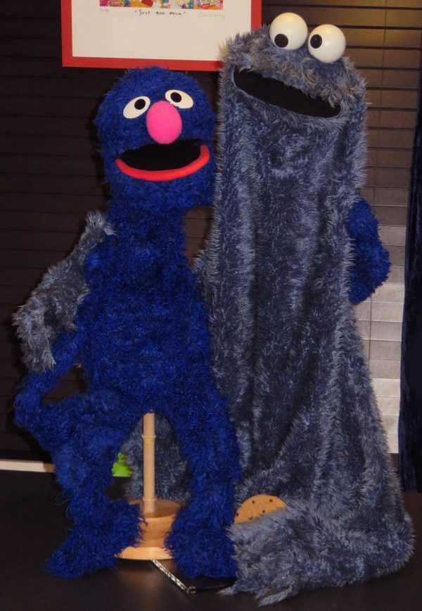 Suffice to say, it was so much more than a standard dream. It was an “experience” in vivid color, and I’ll never forget it. But when I woke up I wasn’t sad, but happy. Happy that Roxy seemed to be well taken care of, wherever she was. I worked the rest of the night around the house, and I made a little puppet stand for my Grover replica Muppet. Until I can get the suspension rig created for him to fly high above in my living room, he’ll have to stay on his little stand in the kitchen. In fact, it looked so good, I snapped a picture of Grover with Cookie Monster on my kitchen table.