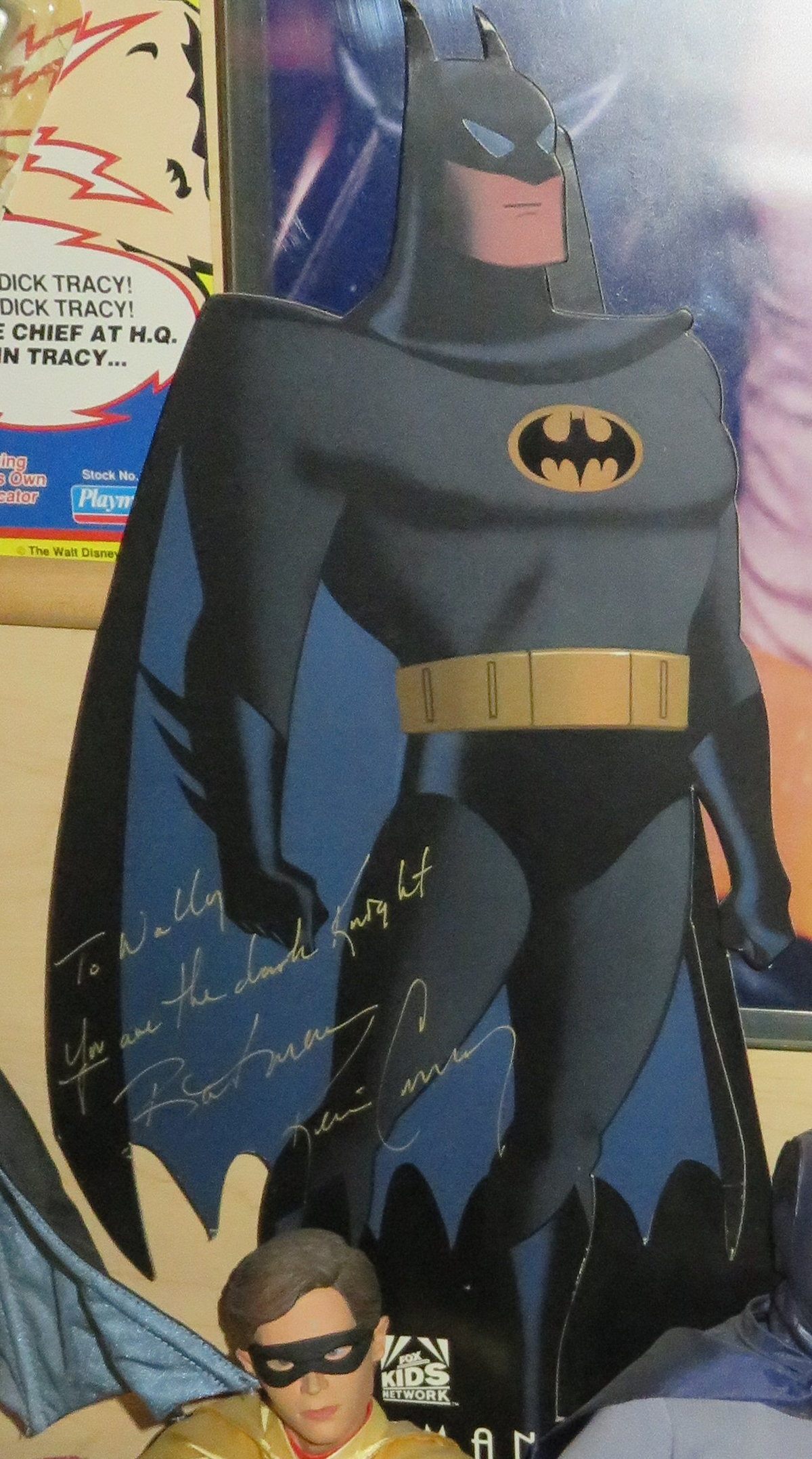 The Wave was about to stage a 24 hour AIDS Radiothon to benefit the AMFAR organization, and they were soliciting packages of items that could be auctioned on the air for the cause. I went upstairs to Fox Kids and got them to donate a bunch of “Batman: TAS” promo stuff, and through Kristene I got in contact with Kevin to ask him to sign some stuff.