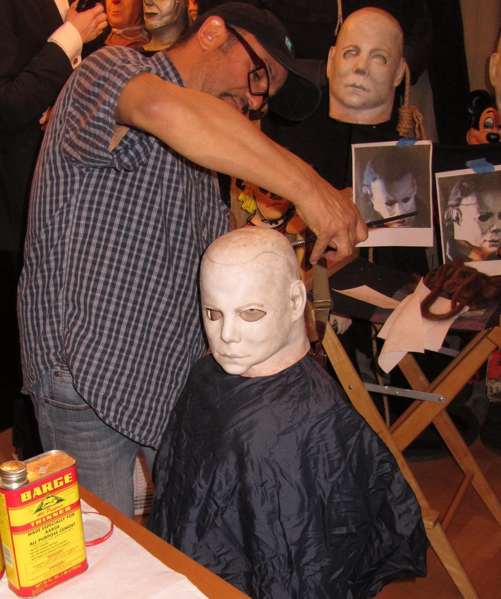 According to our exhaustive research, the type of hair that would have been used on the original Don Post masks was either Yak hair, or something called crepe hair; or crepe wool. We bought a bunch of medium brown crepe wool at a local beauty supply store, and Sergio started laying the hair on the masks with Barge glue. He started on the “Little Mike” mask as a guinea pig.