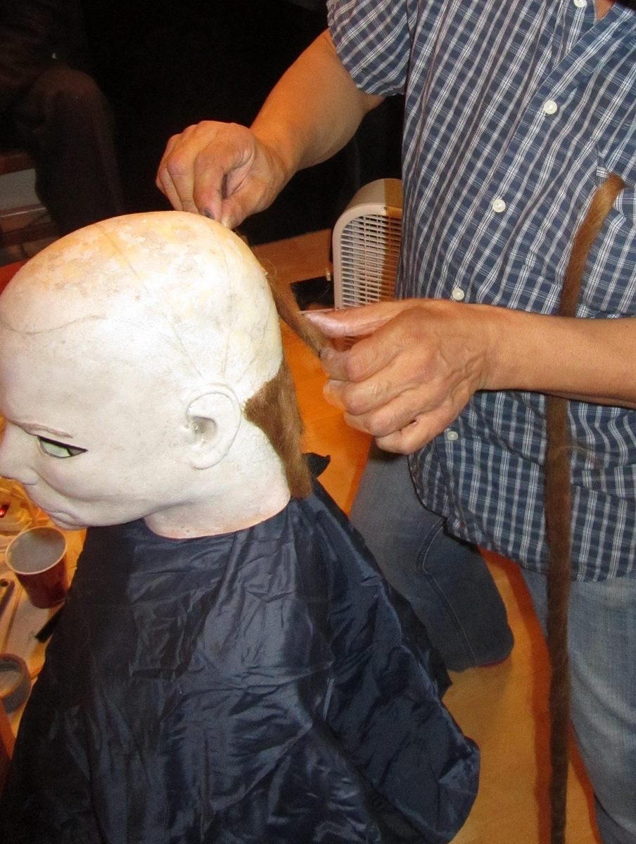 Crepe wool is packaged in braids for convenience. In order for it to be usable for our purposes it needed to be uncoiled and steamed; which straightens out the kinks. Once it’s fully unfurled, Sergio can start attaching the strands of crepe wool to the mask, and cut it to the lengths we need.