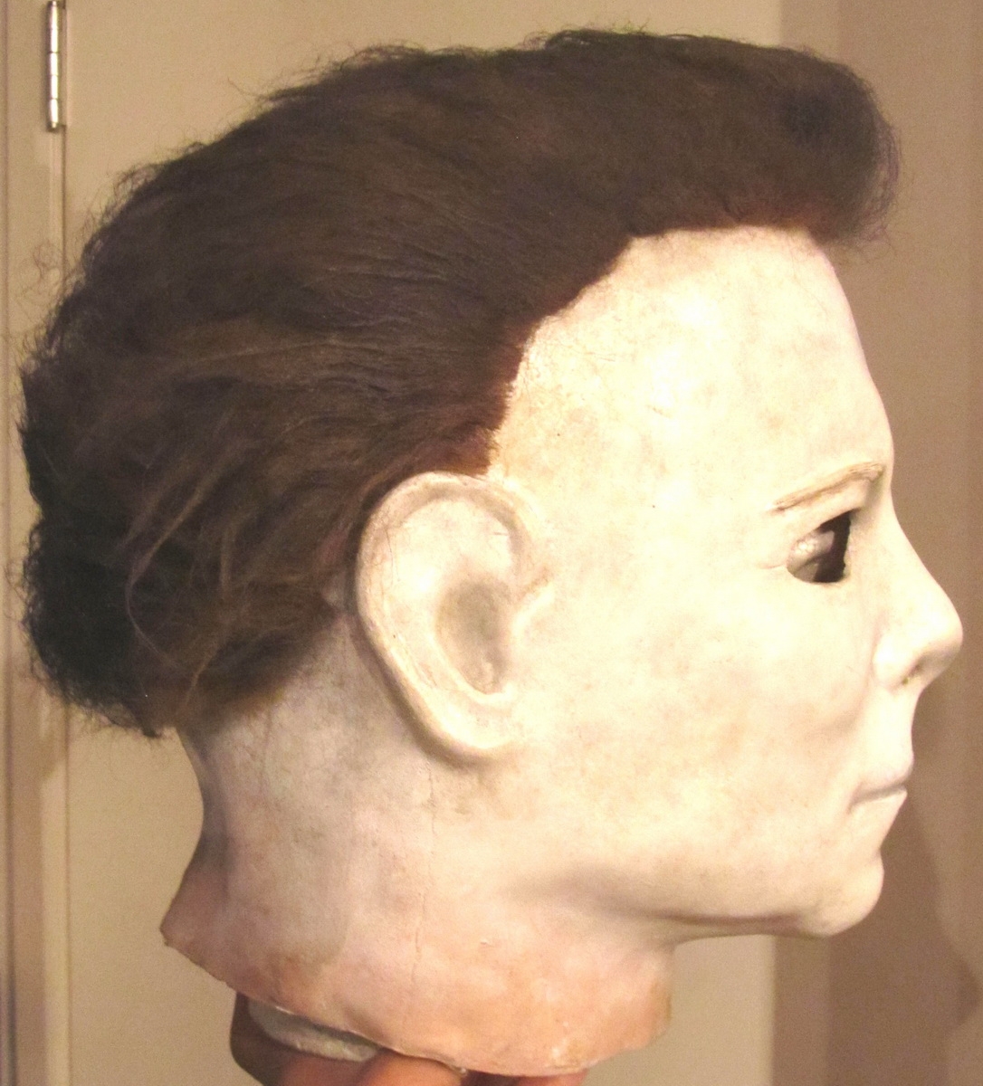 The obvious question is: if you’re going to paint it dark brown in the end, why not just use dark brown hair in the first place? The simple answer is…because they didn’t do it that way in the original film. The original William Shatner/Capt. Kirk mask already had medium brown hair on it. But in order to make it look creepier, the production team on “Halloween” sprayed it with Streaks N Tips to darken it up.