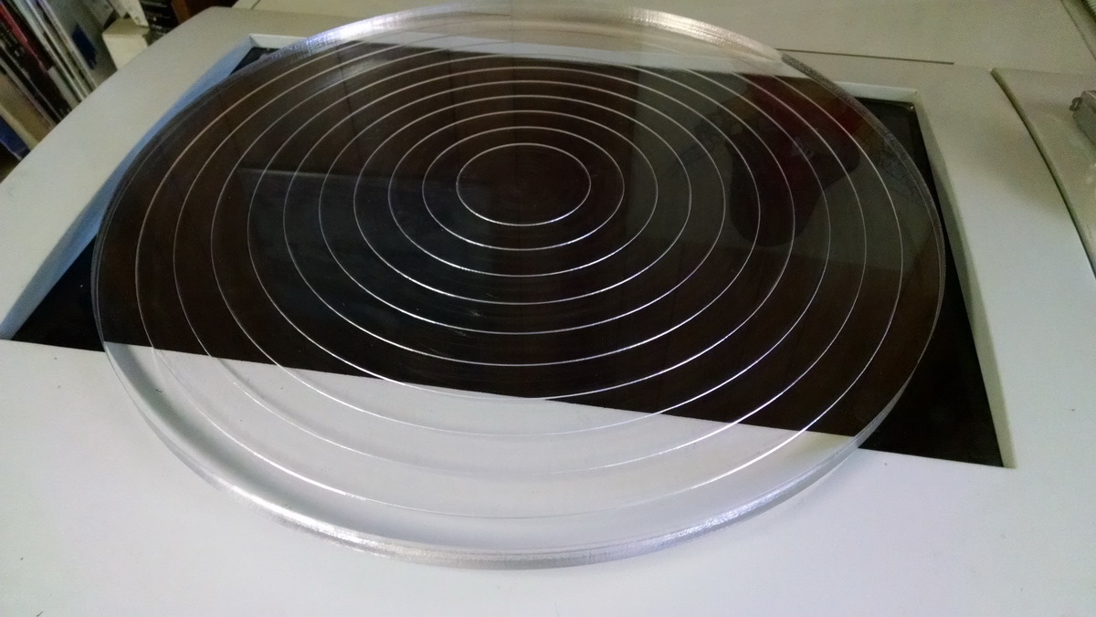 I contacted my pal Kyle Killips at Plastic Depot and hadhim cut a 24” diameter base of clear Plexiglas that was 1” thick. Kyle wrote a program to etch the bottom of the piece so each consecutive ring would diminish in thickness as it gets closer to the center; to give it an interior “dome-like” effect. The other edge of the piece was 1” thick, but as it gradually diminished it ended up being ½” thick in the center. It looked amazing.