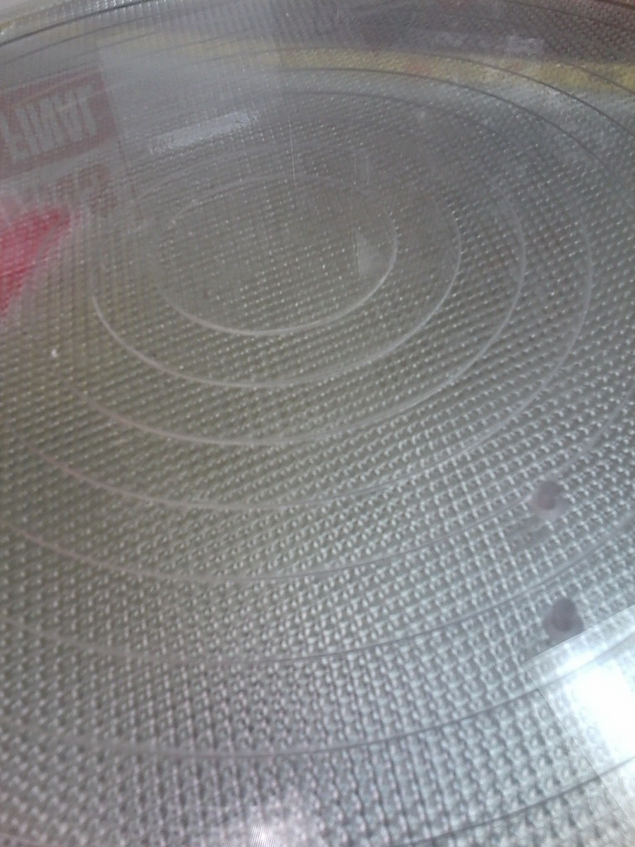 While at Plastic Depot I noticed a big sheet of refractive plastic that was used in overhead lighting bays. It had the exact refractive quality I was looking for to fit under the Plexiglas piece. Kyle cut a piece that fit perfectly into the underside of the base, locking in right after the outer ring. But since the floor underneath was still visible through both layers, I took some opaque silver Mylar and backed the refractive plastic with that. It gave the whole base a very lenticular, 3-D look.