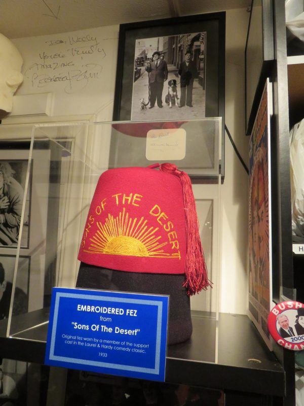 Here’s the final display of the “Sons of the Desert” fez, complete with Laurel and Hardy autographs, my membership certificate, and the fez atop the fez form. It was a lot of work, but I think it looks slick!