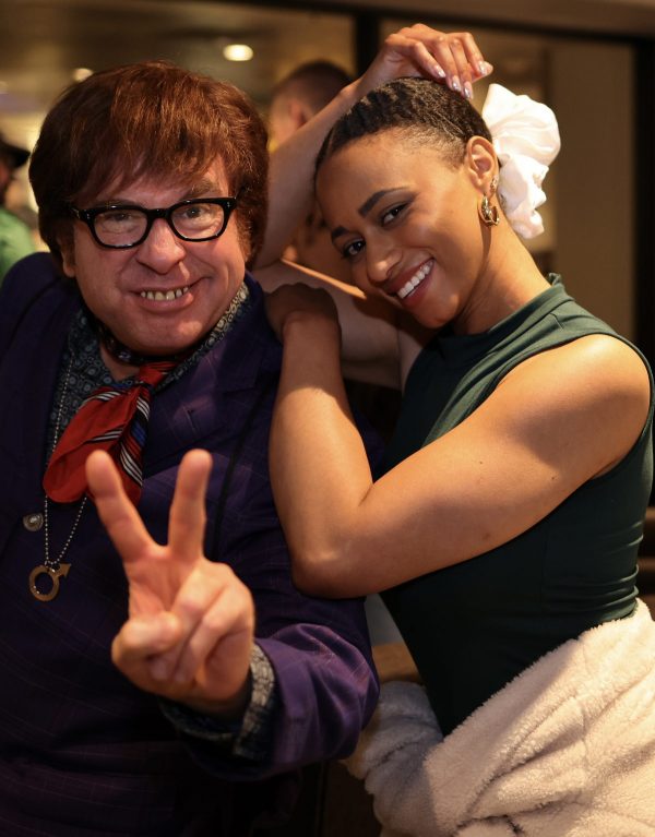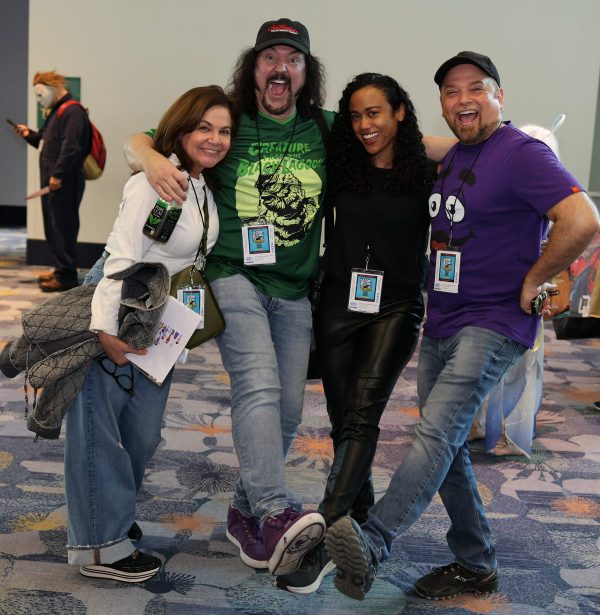 I thought this pic would be funny – the Voice Actor gang doing a kick line. But when I saw Michael Myers checking his texts in the background, I realized we had been deliciously photobombed!