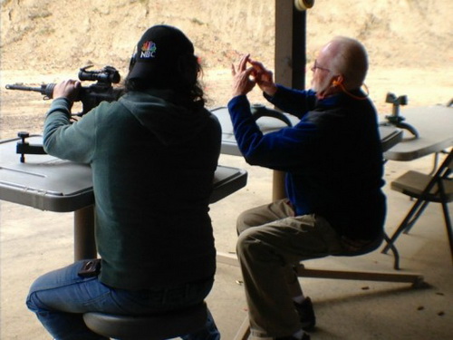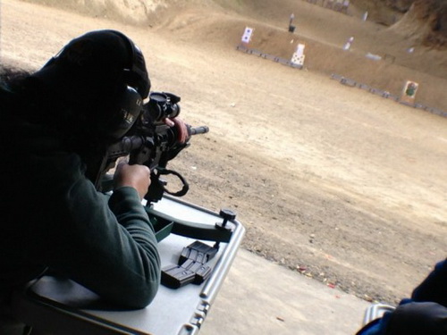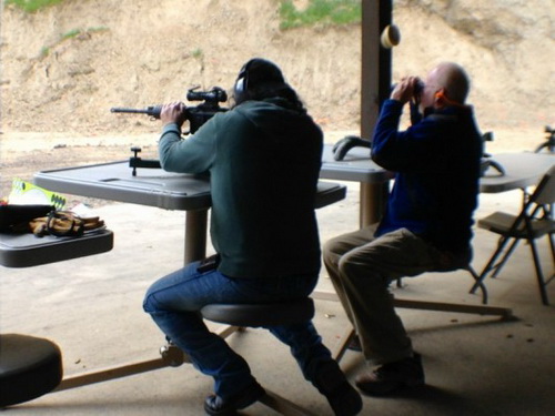 After a few adjustments on the electronic sight, I fire three more rounds. Obi John locates the shots on the target to see if the adjustment was successful.