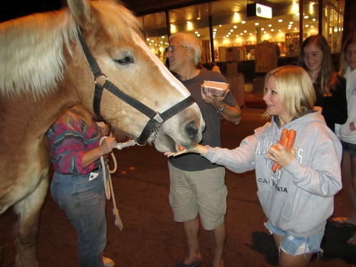 At the Palm Springs Thursday night Street Fair, Edi feeds some horses carrots.