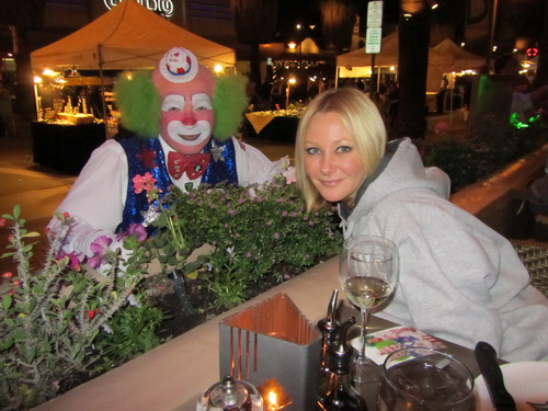 Thursday the 8th – IT’S SO STILL HERE! – Edi put it correctly. She had never been to Palm Springs before, and her comment was, “It’s so still here!” That it is. There’s a magical quality to this area. Still, relaxing, calm. I slept til noon and met Edi for lunch at Panera. We had Bunny in her new little dog carrier on the patio, and we just relaxed looking at the amazing desert scenery that surrounds Palm Springs. The day was warm and mellow. We drove around some more, and then I headed back for a nap. I was certainly catching up on my sleep this trip! And then, my favorite part of being in Palm Springs. The Thursday night Street Fair! It was another great full moon, and there were tons of great dogs at the fair. Bunny enjoyed being carried around and enjoying all the sights and smells. Edi and I got fresh-squeezed lemonade, kettle korn, and we bought hand-made leather i-Pad cases. They were made by a local artist who was a military vet. I also got to stock up on the hand-made soaps I love so much. I bought 12 bars! I also stocked up on the hand-made licorice I love! We got back to the hotel to drop our treasures off, and then we went to a restaurant to eat steak! While we were on the patio people watching, we ran into our old friend Harpo the Clown, a perennial Palm Springs favorite! After dinner we headed back to the hotel to get packed up for our exit tomorrow. Maybe we should have stayed another day!?