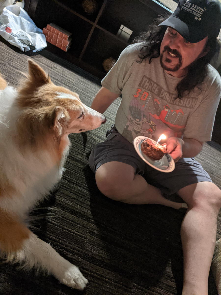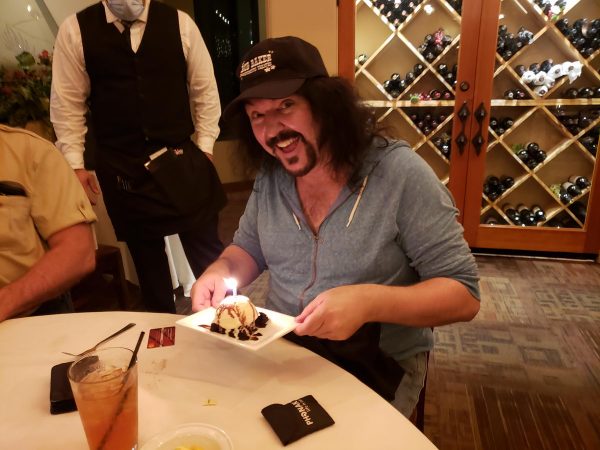 Saturday the 8th – CLAPPING FOR BIKINI BUTT?! – The music channel they play at the Palm Springs Hyatt is terrific! Lots of great tunes! There are a few tables between the bar and the pool that’s under a shady canopy. As Roxy and I were relaxing with a drink at the table, we’d see swimmers walking back and forth between the bar and the pool. When a particular great Hall & Oates song came on, I was patting Roxy’s butt to the beat of the music. (She likes it when I do that.) When I looked up I saw a girl in a bikini looking back at me smiling. At that moment we both realized what was going on. At first, SHE thought I was applauding her bikini-clad shape as she strolled by. The sound of my hands on Roxy’s hindquarters sounded to her like I was applauding her poolside strut. When she realized I was only patting my doggie’s butt to the beat of the music, and when I realized that SHE thought I was applauding her shapely backside, we both started laughing. I had been looking down at Roxy patting her hindquarters, and I never even noticed the girl. It was one of those things that would probably never happen again. Funny! Michelle arrived and joined us at the table, and we got a little snack. My birthday dinner wouldn’t be for another several hours yet, so we got something to hold us over. My pals Scott and Vickie arrived and came up to my room to hang out while I got cleaned up and ready to go get Shirley. We drove over to get Shirley in Palm Desert and then drove over to LG’s steakhouse to meet up with my friends James and Cynthia. I found a great parking spot a half block away (downtown Palm Springs was hopping and it was very crowded!) and pulled in. But I realized that I could move up just a bit more, so I could make a bit more room behind me for another car to possibly park. I didn’t want to be “that guy” who looked like he was taking up two parking spots, particularly given how busy it was downtown. But the Jeep Compass is designed very strangely. I started the car and the wheels wouldn’t move. It seemed like I had the parking brake on. Sure enough, it WAS on, and I had no idea how it got activated. Michelle did a quick search on her phone to see where the parking brake on a Jeep Compass was. Come to find out, the parking brake is just a little tab slightly below the gear shift. So it could easily be engaged by accident as you’re collecting your things to leave the vehicle. VERY poor design! As I was struggling to get the car reparked, I started drawing a crowd. I finally got the SUV situated in such a way that there was a goodly amount of room behind my car to allow another small vehicle room to park. I hope they all enjoyed the show. I’ll most likely never buy a Jeep, as that was just one of the many frustrating design flaws I discovered during the weekend. We sat down and ordered our food and chatted. There were two other tables in the room we were in. One of the servers brought in a huge tray of food and put the dishes down in front of a group of people at the first table. Then he realized he had made a mistake, and removed all of the dishes and put them back on the tray. Then he started toward OUR table with the same food. I was a bit weirded out that he had put the dishes on the table in front of the other group, had left it there for about a minute before he realized his mistake, and had to retrieve all of the food to bring it to another table. Was he going to give us the food that he just sat in front of other people? Call me neurotic, but this seemed icky to me. But the server took the food to the third table and gave it to them. They didn’t seem to complain at all. So this is a legendary steakhouse in Palm Springs and it’s NOT cheap to eat there. I would have thought that the serving staff might have been a bit more organized to prevent them from making such an odd mistake. It was very weird. They didn’t seem to be on their “A game” that evening. Maybe since the state just recently reopened restaurants for indoor dining, they’re still a little wobbly in their organizational procedures. But it seemed like a strange mistake for such a reputable restaurant. I dunno. Maybe it’s me. After dinner we took Shirley back home, and I came back to the room to watch stars on the balcony. It was fantastic, PERFECT weather!