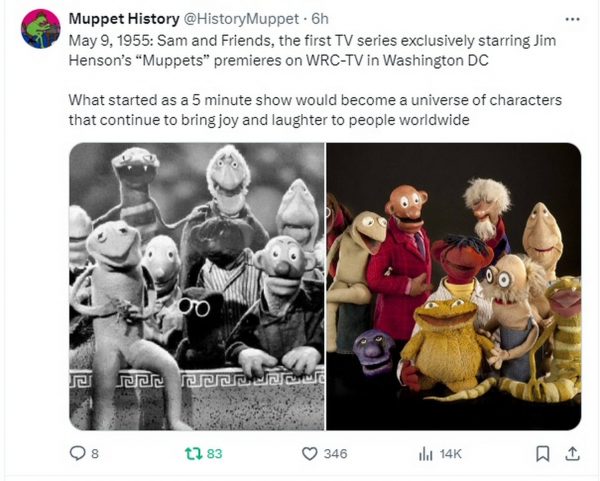 And speaking of early Kermit, he and the rest of Jim Henson’s creations first went on the air with a show called “Sam & Friends” in the D.C. area on May 9th, 1955. This date is often mistaken as Kermit’s birthday, but in fact it was the date that “Sam & Friends” first aired, which featured Kermit in the cast. Allegedly, Kermit was created during the month of March at some point in history.