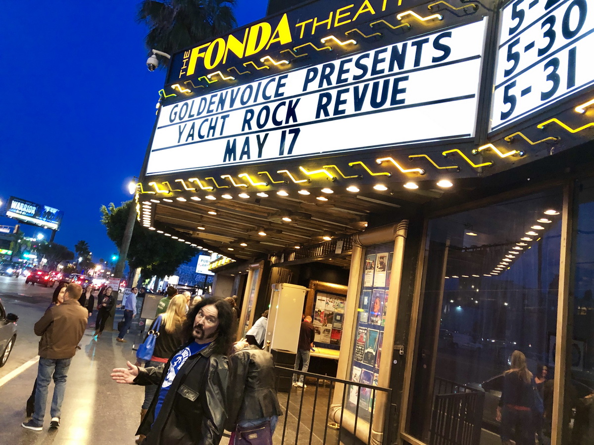 Friday the 17th – AND NOW FOR MY NEXT IMPRESSION…! – I was awakened at 11 by intense ringing in my right ear. It’s very annoying, and I couldn’t get back to sleep. So I stayed up. I did some work and then headed out to get some lunch. I stopped into my dentist’s office to get a dental impression made for my implant crown. I can’t believe in two weeks all that dental/oral surgery madness will be behind me! He removed the little cap that’s in the implant currently, screwed in a little post called an abutment, took a cast of my teeth, took the abutment out and put the cap back in. When they make the cast and send it off to the lab, the technician will build my crown around the abutment. So when the tooth is cast in porcelain it will fit over the abutment perfectly and can be attached permanently. On the wall next to the X-ray machine there was a sign that said, “Before your X-ray, make sure to tell the doctor if you think you may be pregnant.” I said, “Hey doc, that reminds me of a little dental humor. What’s the difference between a pregnant woman and an abutment?” He said he didn’t know. I said, “You can UNscrew an abutment.” I thought he was going to fall over laughing. He said he wanted to use that line at the next dental conference. I told him to feel free with my compliments. I headed home, got my walking clothes on and walked over to Voice Trax West for an hours’ worth of voice tracking for American Airlines. I walked back home, got cleaned up and got ready to go see Yacht Rock Revue at the Fonda Theatre in Hollywood. My pal Officer Mark and his girlfriend Connie, and his friends Mike and Amy all met at my house at 7:30. My old pal Amy from the days at 94.7 The Wave also came by, and we all caravaned over to the local subway station. It was much easier to take the subway into Hollywood than hassle with driving and parking. We got there in just a few minutes, the station where we got off is just a block from the theatre, and it was golden! We even had time to grab a bite before the show. It was a good show, but unlike the past Yacht Rock Revue concerts we’ve seen, there weren’t any special guests; like Elliot Lurie of Looking Glass, Peter Beckett of Player, etc. The band is very, very good. But I really missed those moments hearing the actual voices who made some of those great songs hits. But we had fun nonetheless. When I got home I was totally exhausted from the day so I crashed for a while. I got up later and did some work around the house.