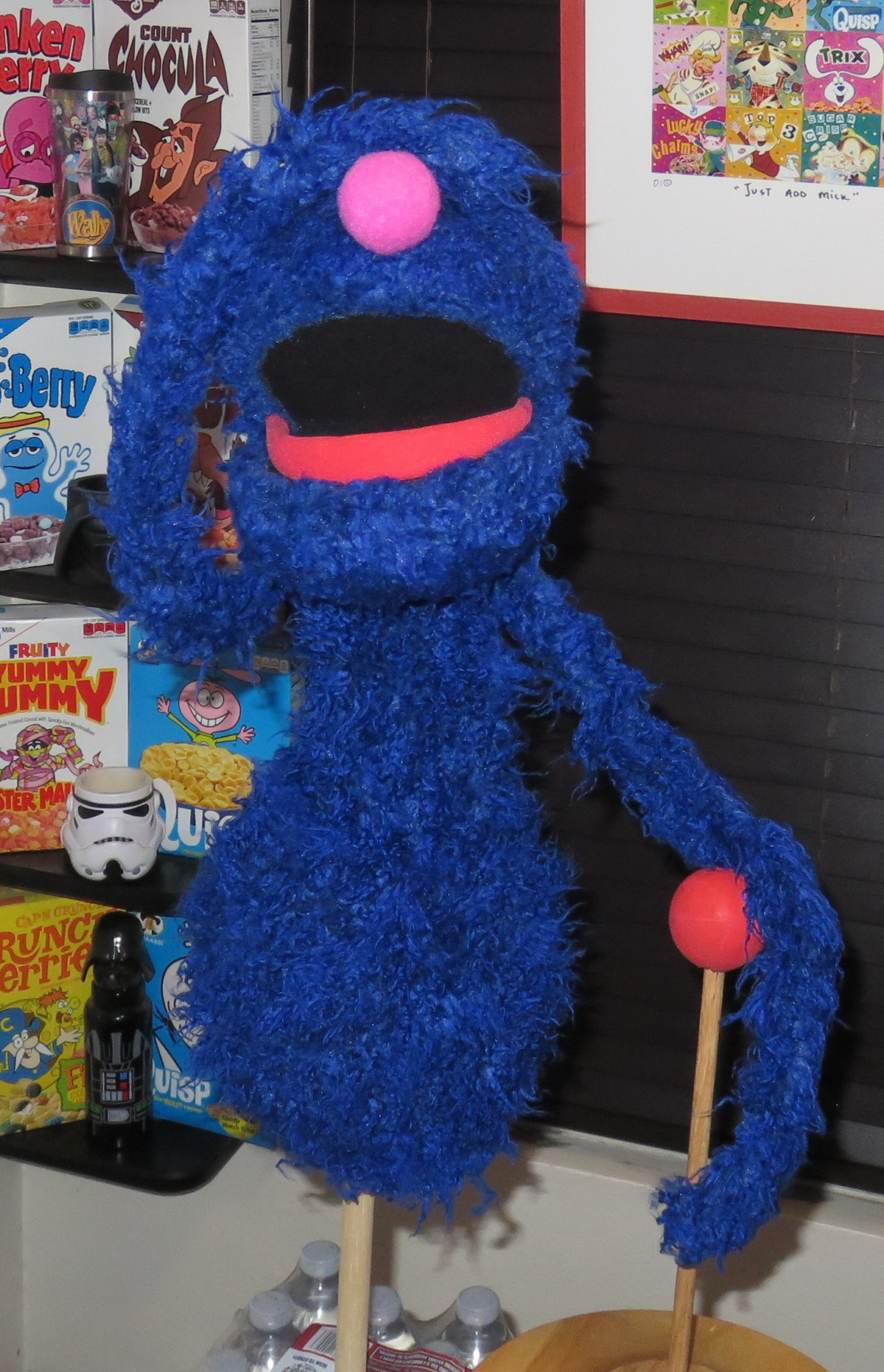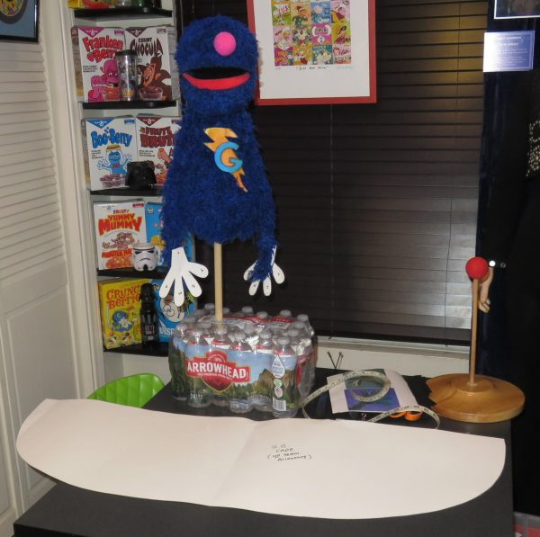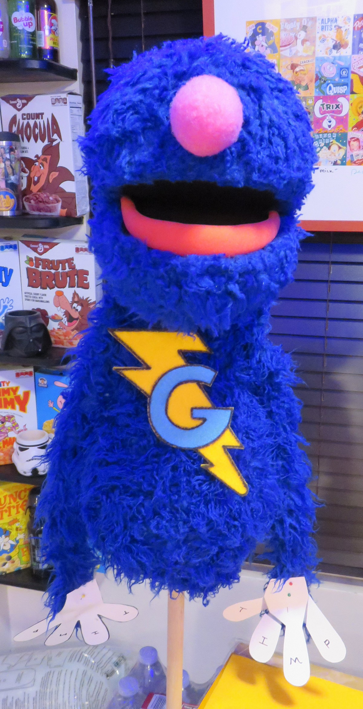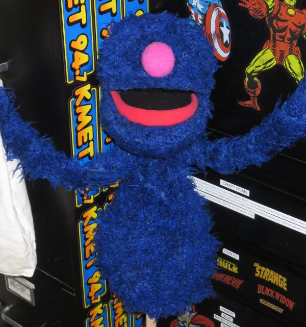 Wednesday the 17th – MORE VISITS WITH MORE OLD FRIENDS! – Since it was a gorgeous day I walked over to Voice Trax West to do a quick session for American Airlines. Hard to believe I’ve been working for airlines voicing their material for over 10 years! I hadn’t been to Voice Trax West in a very long time, and it was good to be back. Engineer Evan and I chatted for a bit to catch up, and the actual session was actually very short; only four short lines. On the way home I stopped by the grocery store to get some supplies, and then headed back to my house. My seamstress Maggie came over to spend the afternoon doing some more work on my Super Grover replica Muppet. She began her visit by apologizing that the birthday gift she had been working on for me was so overdue, but when she unveiled it, I was completely amazed! She had constructed a full-size puppet of the star character from my “Christoween Capers” story series, Donnie Druthers! It was perfect, and I was quite moved by the gesture. I could NOT believe it! It was beautiful! I thanked her profusely and I’m now planning on a very specific display space for him. Unbelievable! It was the first time the lead character from the Christoween series had been realized in a 3-D format. Amazing work! During the past week, in addition to finishing up the Donnie puppet, Maggie had worked on stitching up the arms and tummy piece for Grover. I like to give her homework whenever possible, because I think she likes working at home at her own pace. We patterned out the torso piece, cut it out of the fur, and stitched it together. I began to be concerned whether or not we would have enough of the custom-dyed fur left to complete the puppet. We need to cut VERY conservatively for the remaining pieces we need. Once the torso pieces were cut and pinned together, we pinned it on to the tummy, eyeballed it, and once we were satisfied, she stitched it onto the puppet. Then we pinned on the freshly-trimmed head, and it looked amazing! It was an amazing day of work, but we still have two more full days of work to go. I got ready to have dinner with two MORE old friends; my adopted big brother Rob Richards, and my adopted little brother Alex Zsolt. Rob is a world-renowned theatre organist whom I’ve known since I was 13 years old in Aberdeen, South Dakota. Alex is a world-renowned pianist who has a music ministry and has traveled all over the world. I introduced them several years ago, and now they perform shows together from time to time. Every time Alex visits L.A. for business we all try to meet up for a fun dinner. We met for some yummy food at the Smoke House, which is always fun. The last time I was in the restaurant the manager Christian asked if I was going to bring a puppet again. I asked him who he’d like to see, and his reply was “Oscar!” So this time I made sure to pack Oscar up in my carry-bag and take him with me. But when I arrived I was told that Christian no longer worked there. But as Alex, Rob and I sat there, we heard somebody singing “Happy Birthday” at the table next to us. There were about 15 people, including 3 young boys between the ages of 6 and 10. So, since I had Oscar in the bag who was itching to get out, I decided to bring him out. As I withdrew him from the bag and started unfolding him, the other people in the restaurant started watching. It’s amazing how these iconic puppets always grab everyone’s hearts so reflexively. I took Oscar over to the table and asked whose birthday it was. It was one of the boys. Oscar asked him if he was going to have a dirt pie for his birthday, topped with some mud and sand. Oscar chatted with a few of the other people at the table and wished the kid a “rotten” birthday. As I walked back to my table the birthday group actually applauded! It was amazing. I love being able to use these puppets to bring people joy; much in the same way that they bring ME such joy! I got back home with a tummy full of yummy food and took a short nap. Later I got up for an audition, and then I inventoried the remaining fur we have for Grover. As I sized everything out roughly, I came to the conclusion that we would probably be OK. We still had hands, legs and feet to cut out, but I think we’ll have enough. On the computer I sized and printed the Super Grover chest logo and made a template for when I cut the actual logo out of felt. I reconciled one of my bank accounts and then hit the hay.