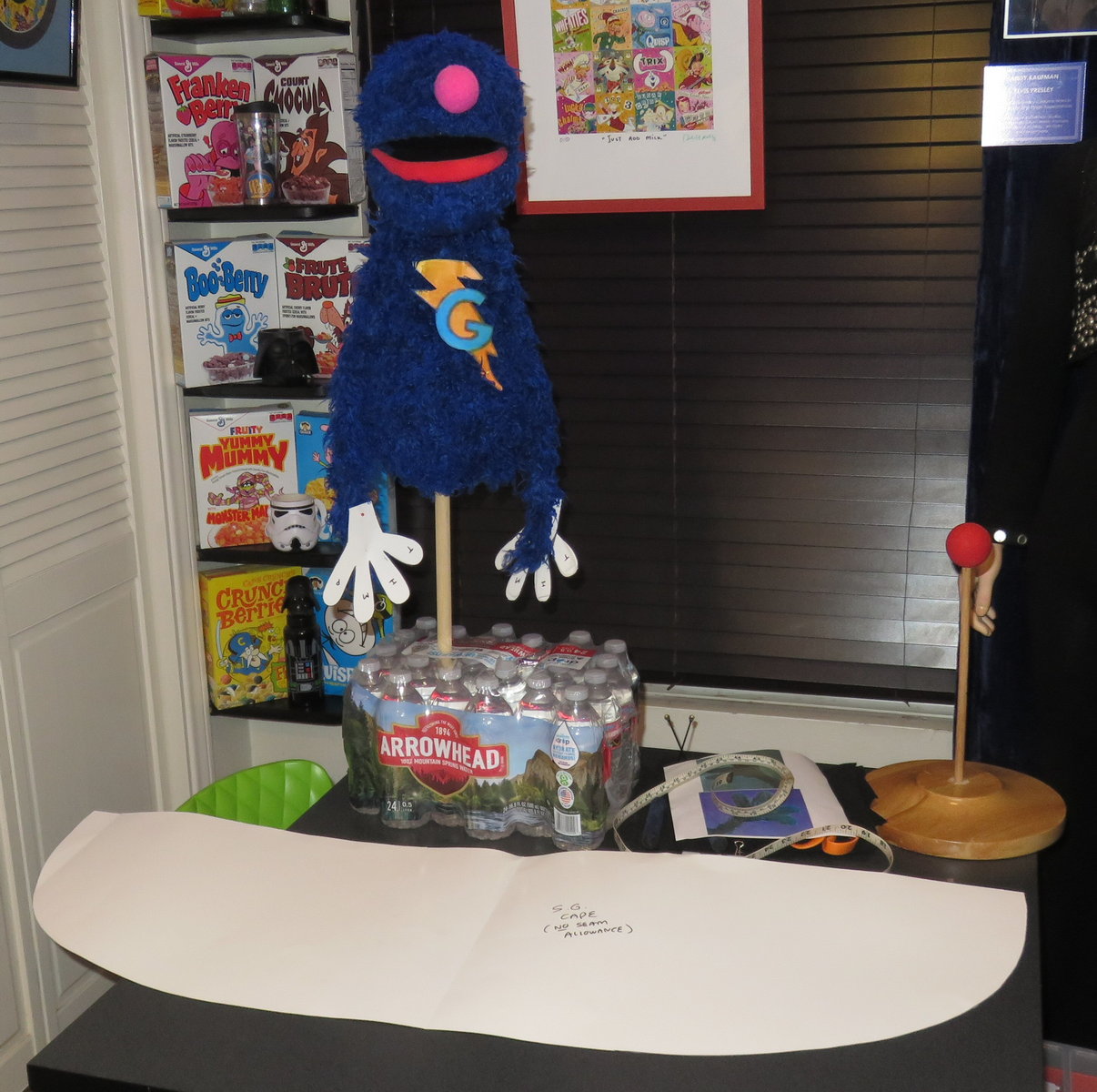 Thursday the 18th – DYNAMIC DUMMIES! – When I checked my emails after I woke up, I found that I had an urgent, last-minute audition to record. After I recorded it and sent it to my agent, I sped off to my mailbox to pick up a very special package. Some mint-condition Laurel and Hardy ventriloquist dummies that I bought on eBay had arrived! They’re not that rare on eBay, but what IS rare, is a set in their original boxes, and WITH their original felt bowler hats. Usually, the hats get lost or crushed, and the boxes get thrown away. But these were amazing specimens of the original toys that looked hardly even used. Plus, the price was perfect! These will look GREAT in the Puppet Room! I went to Paty’s to meet with my pal Drew Massey for lunch. It’s always fun talking puppets and Voice Over with Drew, who has been very successful at both. We talked about the upcoming “Puppet Up!” shows that he’ll be involved in, and he teased some great upcoming upgrades to the show! I can’t wait! When I got home I put on my walking clothes and headed over to Michael’s crafts to pick up some supplies. I needed some yellow-gold felt for Super Grover’s chest logo, and some light blue paint. I didn’t find the felt I needed, but I grabbed a small bottle of blue paint. When I got to the checkout counter there wasn’t anybody there. There were only a few checkout kiosks for self-checkout, but it only accepted credit cards and ATM cards. The bottle of paint was only going to cost a little over a buck and I didn’t want to put that measly amount on my card. I preferred to pay cash, but nobody was around to take it. So I put the bottle down and walked out. Bizarre. Oh well, at least I got a good walk in. I walked back home to do some work. I grabbed a small nap, and later my pal Sara came over to do some work for me. I recorded a short session for a recurring client, and uploaded the files to the rep who handles the account. Then I recorded an audition. While I was looking at Grover I noticed that his tummy was looking a little too small. The Grover puppet from the era in which I’m duplicating has a round tummy that’s slightly larger than his head. So I needed to pad my Grover’s tummy just a bit to be in proper scale. I removed his foam rubber tummy piece and cut four pieces out of ¼” foam rubber, and attached them to the outside of his tummy piece. Once the extra pieces were permanently attached, I worked the tummy piece back into the fur covering. It looked GREAT! He’s really coming together nicely, and I can’t wait to unveil him at the upcoming Monsterpalooza in just a few weeks. I took a short nap, and then got up later to finish patterning out Grover’s hands, cape, and legs. Thankfully, it looks like I’ll have enough of the custom-dyed fur to get everything made, with some to spare. I unpacked the Laurel and Hardy dummies and did a little sewing on the straps on their overalls. Then I set them up in the Puppet Room. They look fantastic; super clean and nice! I made a huge salad and watched a few episodes of “The Lone Ranger,” followed by two episodes of “Have Gun – Will Travel” on the H&I channel before bed.
