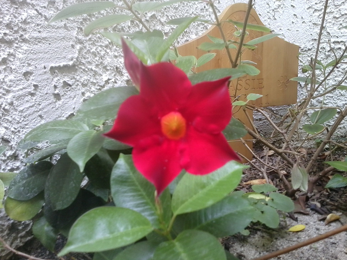 In my little memorial garden I’ve dedicated to the memory of my dog Sassie, a beautiful red flower bloomed today! Stunning!