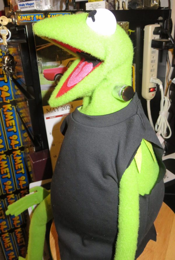 Monday the 20th – LOST FROG! – The day started with a last-minute audition, and then it was off to JoAnn’s fabrics to find some “suit”-able material for the Frogenstein costume I was having made for Monsterpalooza. The idea is to mash-up Kermit the Frog with Frankenstein for the upcoming Monsterpalooza convention the first weekend in June. I don’t want to take my 1:1 Kermit the Frog Muppet replica out of the house anymore, because it’s too valuable to me, and I don’t want something happening to it. It was made by a famous builder who’s not building any longer, and being a direct one-to-one replica of an original Kermit, I just don’t want to risk it. I would never get another one like it. I bought a new Kermit replica from a talented builder in Florida, and it was due today. The first one I bought from him a few months ago was too small to fit my hand, so I had to send it back. Now, I requested that this new one be enlarged so it’s closer to the measurements of the real Kermit. I sent him detailed and specific measurements of my 1:1 replica and luckily he was able to complete it in just under a week. But the shipping was standard US Mail which I try to never do if…1) the item shipped is particularly valuable, or…2) the item needs to be in my hands within a specific time. Hopefully it will arrive today, but the internet tracking isn’t very promising. I hope he’s not lost! I picked up some great twill suiting material that’s not-quite-black. It’s lightweight and should do very nicely! I stopped at my box to get my packages, and I got several other pieces of mail…but no Kermit. Rats! It was time for lunch so I stopped at Paty’s to have lunch with my talented young friend Isaiah Ferguson. He’s a terrific animator and cartoonist, and I’m engaging him to create a 1 minute stop-motion video based on a snippet from the first Christoween story. I’ll be releasing it this October! I’m very excited! He and I had a great time sitting at the table and storyboarding the video, and I was shocked at how like-minded we both were on the concept. This will be amazing! I’m looking for something that will really give the concept a boost to try and get it into the right hands for the next stage of development. I needed to drive to the auxiliary garage to do something with my Mustang. I had that wonderful cut-off switch installed on the negative terminal of my battery so I could disengage it when the car sat idle. However, when I put the Mustang to bed recently, I had forgotten to do that. I told Isaiah I would drive him to the train station if he didn’t mind a quick pit stop first. We drove over to the auxiliary garage and he marveled at all of the sweet vintage cars that are also parked up there. I unlocked the car cover, raised the hood, disengaged the power switch, locked her back up, and off we went. Since we were in the area we stopped over at Foster’s Freeze to get some ice cream. Then I dropped him at the train station so he could catch the subway to his house. I got home and did some work until it was time to meet up with my pal Officer Mark. He came over and we headed to Bob’s Big Boy for dinner. Then I came back home to relax, and later I did my nightly auditions, took my nightly WOG (walk/jog) and spent some quality time outside in my anti-grav chair. I like sitting outside in the quiet after my WOG; sipping an iced tea and relaxing/meditating/unwinding/decompressing. It was a warm night and not too cloudy. I watched a mostly-full moon set behind the trees. It reminded me a bit of being in Palm Springs at the Hyatt hotel, which I miss very badly. I came back inside to edit some music and write Wally’s Week. According to the USPS website, Kermit was stuck in Phoenix, with no indication when he’d be arriving in L.A.! THIS is the very reason I no longer use the USPS for anything of import. Horrible tracking protocols, late delivery, etc. Unfortunately the builder didn’t even send it Priority Insured, so who knows when Kermit will arrive; if ever. I made a salad and watched “Collector’s Call” recorded from last Sunday night.