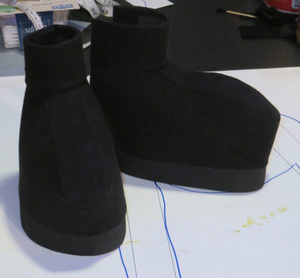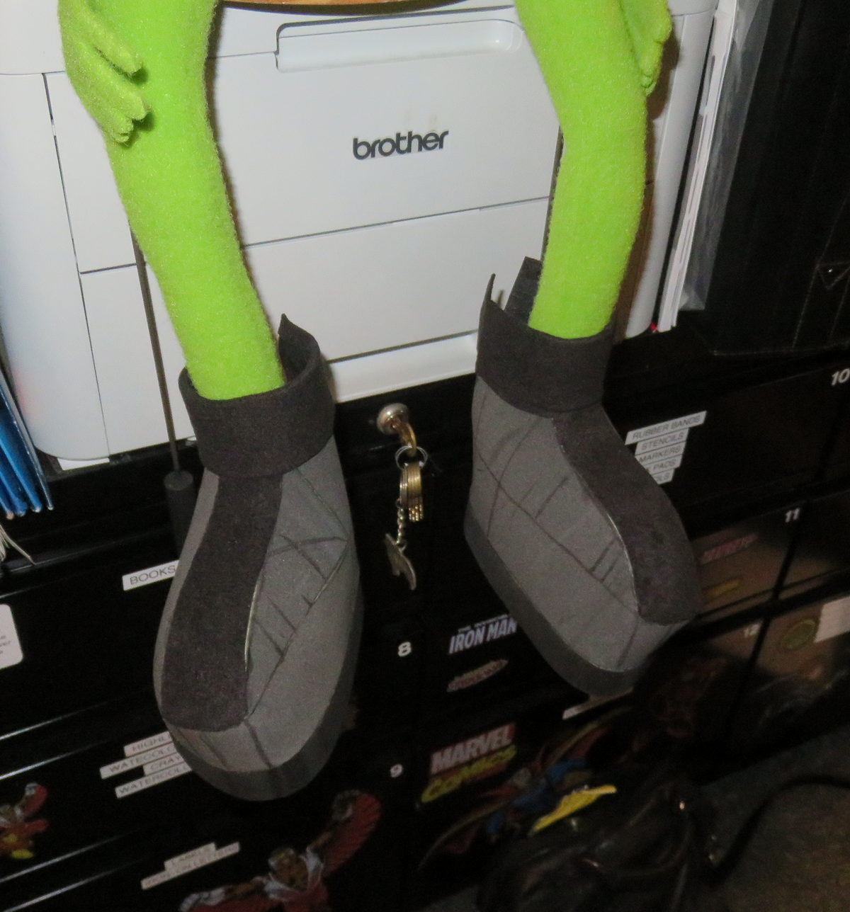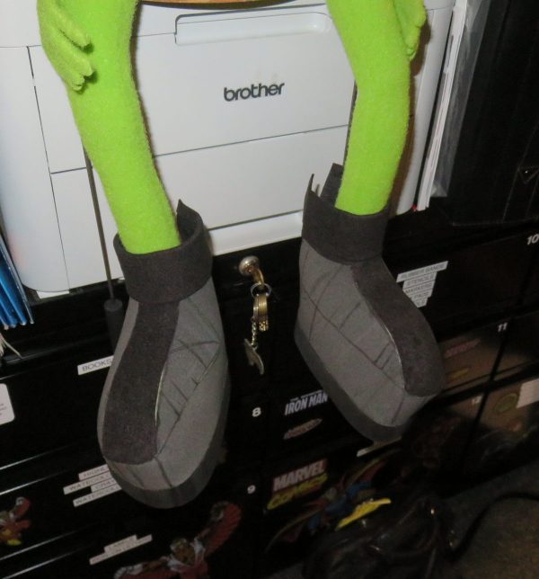 Thursday the 23rd – CONFESSIONS OF A MONSTER SHOE COBBLER – KERMIT HAD ARRIVED! I sped over to my box to pick him up and he was gorgeous! Very well, made and a good size. This was going to be fantastic, and hopefully the appearance of Frogenstein at next week’s Monsterpalooza convention in Pasadena will be fun and funny! After taking possession of a very-late frog, I high-tailed it over to the studios of Alex in Wonderland (who would be making the Frogenstein costume). We’ve lost several days in the fabrication process, so time was of the essence. I’m just glad she’s not in the middle of a pressing job right now, and would actually have a few days to make this! We also discussed the “nose-job” on my Count Von Count replica. His new nose, monocle, and eyebrows will look pretty sweet when they’re finished. She measured my new Kermit replica so she could start fabricating the costume. I traced his feet for his boots, and she cut the soles out of 1” thick L200 (a rubbery fabricating material that can be used for most anything) on her band saw. They turned out amazingly well! They were way more precise that I could have done simply with a razor blade! I went back home and did my nightly auditions. Later I took my nightly WOG and spent some peaceful time relaxing afterwards in my anti-grav chair. I was pondering how I was going to make Frogenstein’s monster boots, and I think I locked into an idea how to do it. I came back inside, set up the materials I would need on my kitchen table, and started fabricating. The first boot turned out “just OK,” but the second boot turned out better. I redid a few aspects on the first boot to make it more like the second boot. I’m going to finish them up on Friday, but so far – so good.