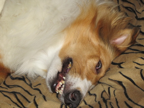 Roxy was sound asleep on the bed and almost seemed like she was smiling!
