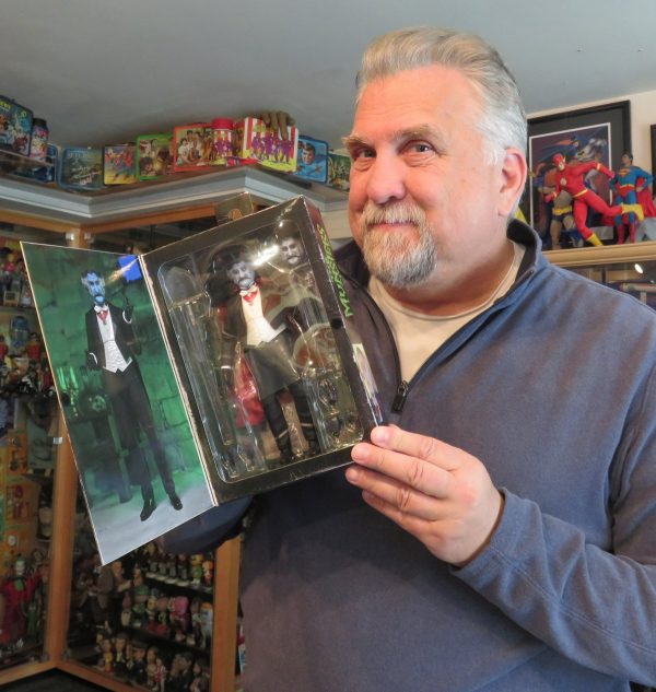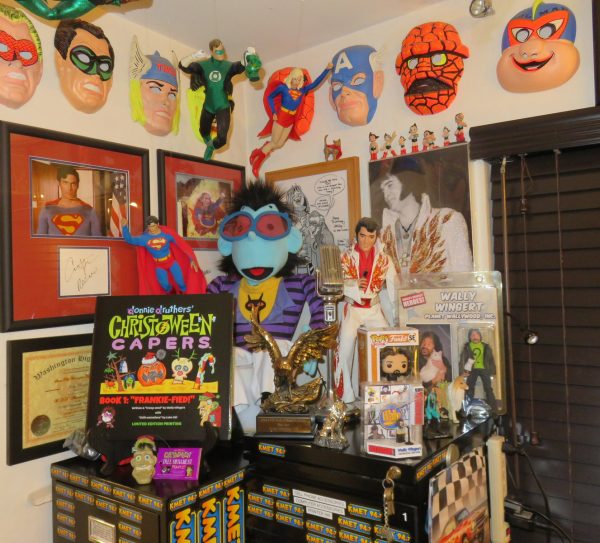 Saturday the 27th – LIKE A MIME! – Since I needed some grocery items, I decided to walk to the store on a very windy day. I felt like a mime doing a “walking against the wind” routine! It was NOT fun nor was it enjoyable! It’s even tougher walking against the wind with your arms full of heavy groceries! But I made it. As a test, I screwed in Grover’s arm rods into the little wrist pieces and they worked perfectly! I turned on the black light in the Tranquility Zone and relaxed for a while. When I got up later I drove to my mailbox to get an item that had been left in one of the lockers for me. I knew that I’d be seeing my old pal Daniel Roebuck on Sunday afternoon, and I realized late in the day that I had just received the new action figure of The Count from Rob Zombie’s “The Munsters” at my box. Since Dan played The Count in the movie (also known as Grandpa Munster) I wanted to have him sign it. But by the time I realized that the figure was waiting for me at my box, it was just a few minutes before my mailbox place was closing. So I called them and they agreed to put it in a locker for me, and gave me a code to unlock it. Pretty slick! Otherwise I would have had to wait until Tuesday to pick it up, and I would have to wait until I saw Dan again to get it signed. I punched the code to gain access to the store, punched in a different access code to gain access to the locker, got my package and headed home. When I got back I put a Tony Clifton decal on the side back window of the Gray Ghost. Because the windows are all darkened, and the decal is black, it’s difficult to see. But it’s subtle. I had them print it backwards so I could apply it to the INSIDE of the window. That way when I got to the car wash it won’t get damaged. Then I went inside and made my traditional Saturday Night Super Saint Salad and watched an amazing episode of “The Saint” called “To Kill a Saint.” Amazing!