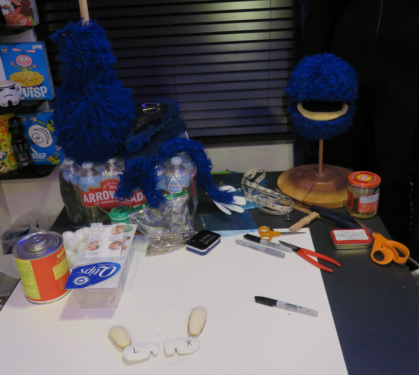 Thursday the 25th – SNIPPING, SHAPING & STOOLING! – Just to be sure my stuffy nose wasn’t the result of another sinus infection, I called my doctor for a telemedicine visit. He called in a prescription for me at CVS, and I walked over to the store and picked it up. I picked up a few grocery items as well, stopped by the hardware store to get a wood dowel to make a puppet stand for the Donnie Druthers Christoween puppet Maggie had made me for my birthday, and with an armful of groceries and supplies, I walked back home. I ate a light dinner, and then started snipping Grover’s fingers again to define and shape them. I stopped for a quick nap, and got up later to record all my nightly auditions. Then I got out the saw and the drill and put together a new puppet stand for my Donnie Druthers puppet. I found a little foam piece from some packing materials that would make for a perfect stool for him to sit on. The wood dowel I bought earlier was cut to size and I attached it to the base. It looked perfect! I put him on display in a corner of one of my rooms along with a big hardcover version of my first Christoween story. I think I’ll call the area “Christoween Corner!” I finished the night by doing more snipping of Grover’s fingers. He only has 8 fingers, but shaping each one takes a TON of time to get it perfect!