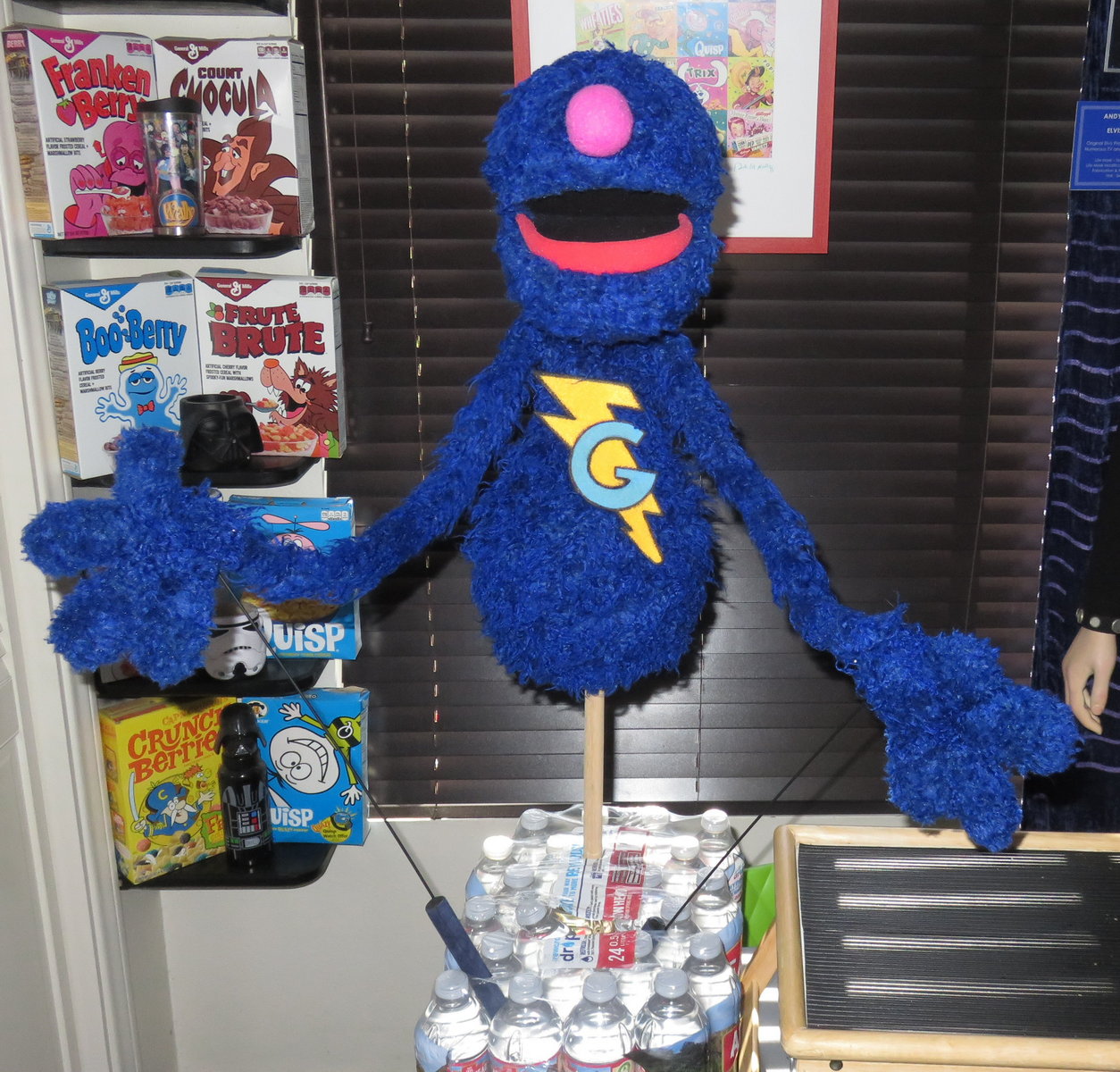Sunday the 28th – PUPPET PLAY! – My pal Dan Roebuck, his wife Tammy and her daughter Julia came by to take a tour of Planet Wallywood. Dan said that Julia had been talking about making a puppet, and asked if they could come by to discuss puppet building. I said I’d be glad to! We chatted all about puppets for two hours, I gave Julia a chance to work with a few puppets, and Dan was kind enough to sign my Count figure. After they took off I headed to Paty’s to get some lunch. I had fully intended to get my usual salad, but once I got there I realized that it was chicken noodle soup day! Since it was chilly and gloomy out, I fell back on my usual “rainy day comfort meal” of a grilled cheese sandwich and fries, a side of ham, and a bowl of chicken noodle soup. It was pleasant sitting there on the patio on a gloomy day enjoying a comforting meal. It’s a good thing too. I started to think about my late dog Roxy and my late “adopted grandma” Shirley and I became quite blue. It was tough and really sucked a lot of the excitement of the amazing day I had enjoyed so far. So when I got home I climbed in bed and took a nap. I got up later and did some work, placed the nose on Grover where I felt it should go, and drove to Denny’s to get some food. When I got back home I took a WOG, and had another GREAT blood pressure reading afterwards; much better than even the previous night’s! I enjoyed eating my Denny’s food and watching a few episodes of “The Lone Ranger,” followed by a few episodes of “Have Gun – Will Travel!” I LOVE that show, and the lead actor Richard Boone is amazing to watch!