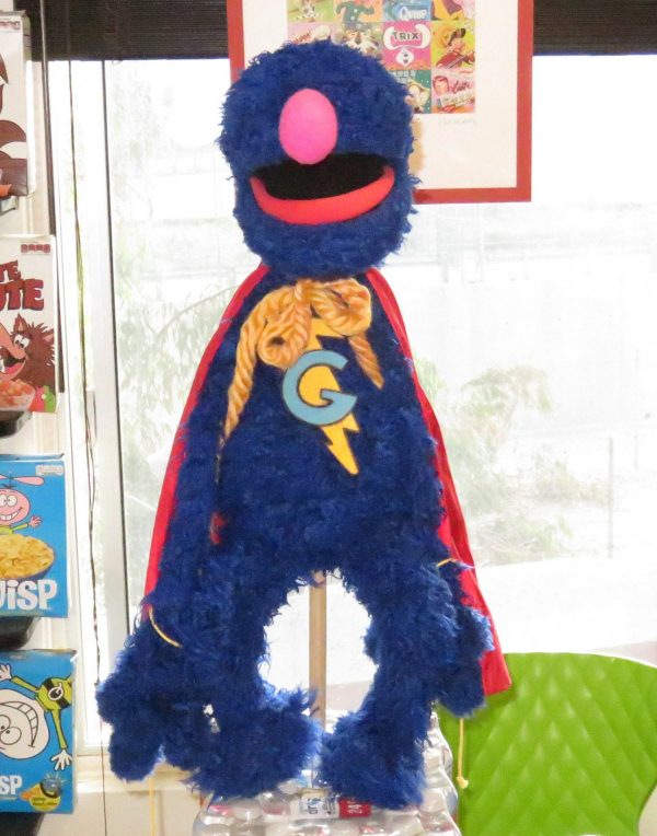 Monday the 29th – MEMORIAL DAY! – Since it was a holiday it was a great day to get some things finished up. First, Maggie came back over to finish up Super Grover. She attached his legs and feet to his body, attached the nose to his head, and put the cape ties on his cape. He was looking good! After she left I got cleaned up and headed into the Cinelounge in Hollywood to see Dan Roebuck’s new film “Lucky Louie,” a film he wrote, directed and produced with his daughter Grace. He also acted in it as well. It was fully enjoyable and I’m so proud of him for making another film a reality! I came back home and grabbed a short nap, and then started scrutinizing Grover. I realized that the wrist ties on his cape were stitched to the OUTSIDE hem of his cape, when they should have been sewed to the INSIDE of the hem of his cape. I didn’t catch it earlier, so I cut them off and restitched them myself. Then I noticed that the chunky yarn tie that goes around his neck was starting to unravel, making it look much too thick for the scale of the puppet. I’m not sure how to freeze yarn into the thickness you need, but this may require the help of Alex in Wonderland! I also noticed that his nose was slightly too low on his face. One thing I’ve learned over all the years of puppet building; 1/32nd of an inch can sometimes make a HUGE difference. It just needed to be raised a few millimeters to look right. Again, I’ll ask Alex in Wonderland if she can just put a few stitches in at the top to give him a little nose lift. His helmet should be almost done, so I’m hoping I can go into Alex’s shop tomorrow and get these little minor details rectified.