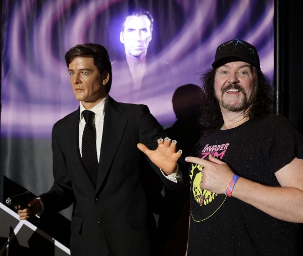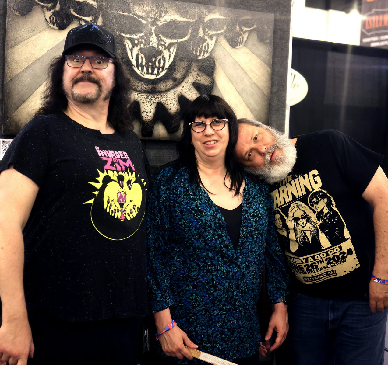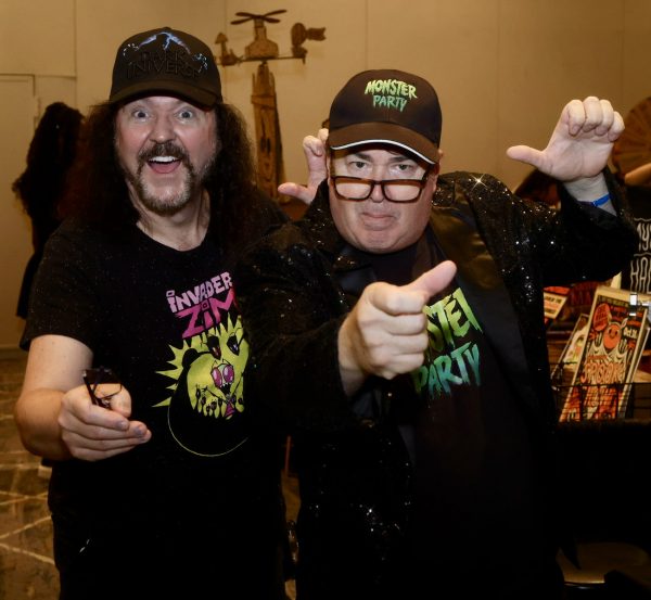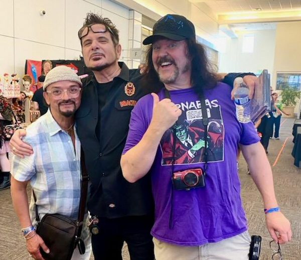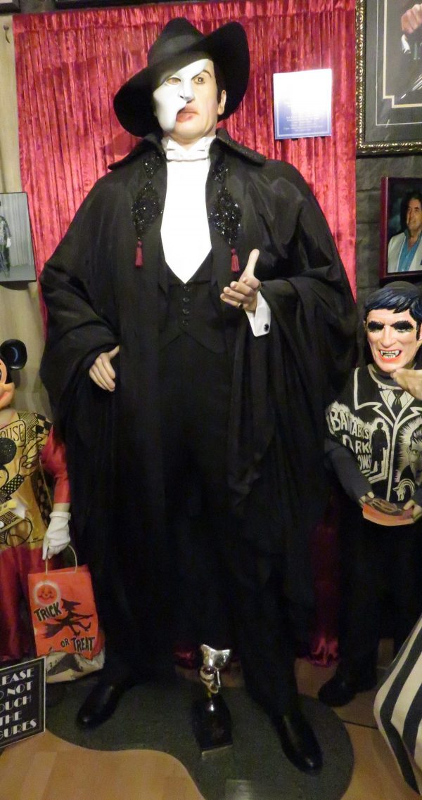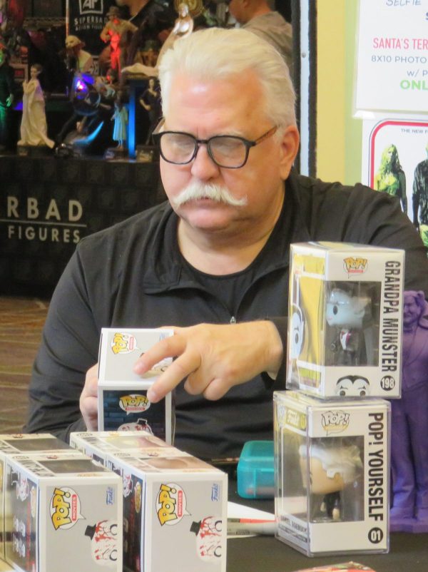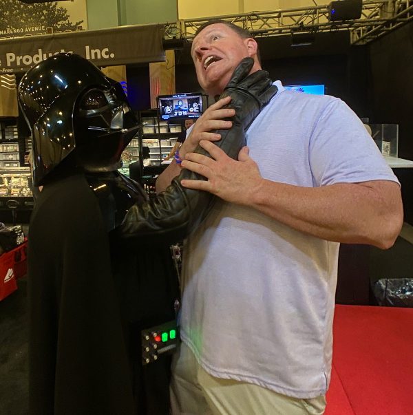 Saturday the 31st – MONSTERPALOOZA: DAY 2! – My pal Mark Fullerton came by so he could spend the day at the con doing what he loves best…taking great photos! I was also joined by my friend and Christoween attorney Stephanie. She always loves looking at the latest monster trends to edify her personal research for our Christoween IP. My friend Sara dropped by to have some fun, and my pal Chris Malmin took a few hours off from watching Spook at my house to drop by as well. He had intended to come in full make-up as Peter Criss from KISS, but he texted me and told me that he didn’t like the way his make-up job turned out, so he’d just be showing up as himself. Mark, Stephanie, Sara and I took a break from the convention floor and headed over to the hotel to grab lunch. The restaurant is poolside, and since there were plenty of bathing beauties by the pool, I made sure to grab the best table in the house! After lunch Sara and I headed up to the room so she could help me get into the Darth Vader costume. If you recall, I started cosplaying as Darth Vader back in 1980, before the word cosplay even existed. My costume was VERY homemade; constructed of pasteboard, vinyl and wood. But it was effective for what I was doing back then. However, today, a company called Jazwares released a nearly-complete, screen-accurate Darth Vader costume (complete with rolling carrying case) for $1,000. I just had to have it! My idea was that I would wear it on the convention floor for just one hour, before retiring completely and putting the costume on a mannequin in Planet Wallywood. Then my Darth Vader cosplay adventure would have come full circle. Unlike the homemade costume in the early 80s, this one took two people to put on, though the effort would be worth it. For a convention like Monsterpalooza, Darth Vader seems an odd fit at first glance. But when you consider that Darth Vader is the most terrifying monster in the galaxy, I think it could fit very nicely. It took about a half hour to fully complete (we had a very tough time getting the straps on the shin guards to work right). By 4pm I was ready to rock. I’ve customized the Jazwares costume with a few upgrades. First, I had Alex In Wonderland tailor the cape and cloak to fit my build. I also had her add a lot of Velcro to certain places, so the chest box, the belt, and the breastplate wouldn’t move around once it was on. She also put Velcro on the shoulder pieces so the cape would affix nicely, so it didn’t move back and forth. I bought a nice 3D printed lightsaber hilt that I clipped to the belt, and I also found a wonderful pair of Propet men’s boots in size 13EE. The reason I got them so large is because I had 2 inch lifts inside the boots. The larger boot size could easily accommodate the extra space taken up by the lifts, as well as my feet. But they were very tough to walk on after a while. Given my own height, the height of the heel on the boots, the lifts inside the boots, as well as how high the helmet is, I clocked in at a total of about 6′ 5″! One of the things I wish Jazwares would have done differently is the configuration of the lights on the belt packs. I know it’s convenient to be able to push the green buttons and they light up, but as you’re walking around in the costume it’s common that the buttons get bumped, and consequently turn off. Luckily Sara was there to make sure my lights stayed lit. Either I would bump them and turn them off, or people would accidentally bump them when taking pictures and turn them off. But the chest box with the alternating lights and the breathing sound effects was amazing! I also had a microphone inside my helmet that was attached to a speaker on my belt. This way I could talk and people could hear what I was saying. It was hot in the suit, I couldn’t see very well because the eye pieces would fog up, and it was difficult to walk – but man was it fun!!! There’s really not a person on Earth who doesn’t know who Darth Vader is. I kept my walking pace up considerably, as I love that “Vader’s in a hurry” gait, similar to how you saw him in “Empire Strikes Back” when he’s trying to catch the rebels in the Hoth base. Or when he’s walking with the Imperial commander telling him he’s come to put them back on schedule for building the Death Star. Vader never seemed to lumber along. I went to visit my pal Scott in the PPI booth, and he was playing some terrific music that had everyone in high spirits. When I performed as Darth Vader back in the 80’s, I usually was with a mobile disco company called “Disco On Wheels.” So dancing as Darth Vader was not uncommon at all. It was great to do a little Dancing Vader once again on the Monsterpalooza convention floor! But after about an hour of frivolity, I had about enough. Unlike the old days, when I could stay in the costume for hours, I was ready to be Wally again. 45 years made a huge difference in my enthusiasm for staying in that costume for long periods! I headed to the room, changed out of the costume, and showered. The bodysuit was SOAKED! I went back to the museum and hung out around the Roger M00re exhibit. It’s funny that many people didn’t know why Bond’s fingers were missing. I would just smile and say, “Watch the movie.” Hopefully I inspired them to dig out an old 50 year old movie and enjoy it again! I thought that I should have had a QR code posted next to the exhibit that would take people to the clip in the film where Scaramanga shoots off the four fingers on the left hand of his James Bond effigy. But hey, I just wanted to plant a seed in hopes that people would get curious and go rent the film again. By late Saturday afternoon my voice was REALLY bad. Luckily I still had my lower register, so doing the Darth Vader voice wasn’t hard, but my regular speaking voice was very rugged! I needed voice rest badly! The show closed at 6, I turned off the backlight on the Scaramanga backdrop, an